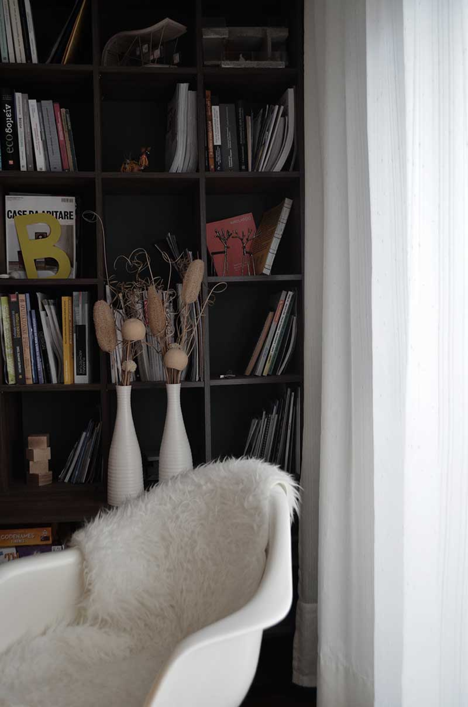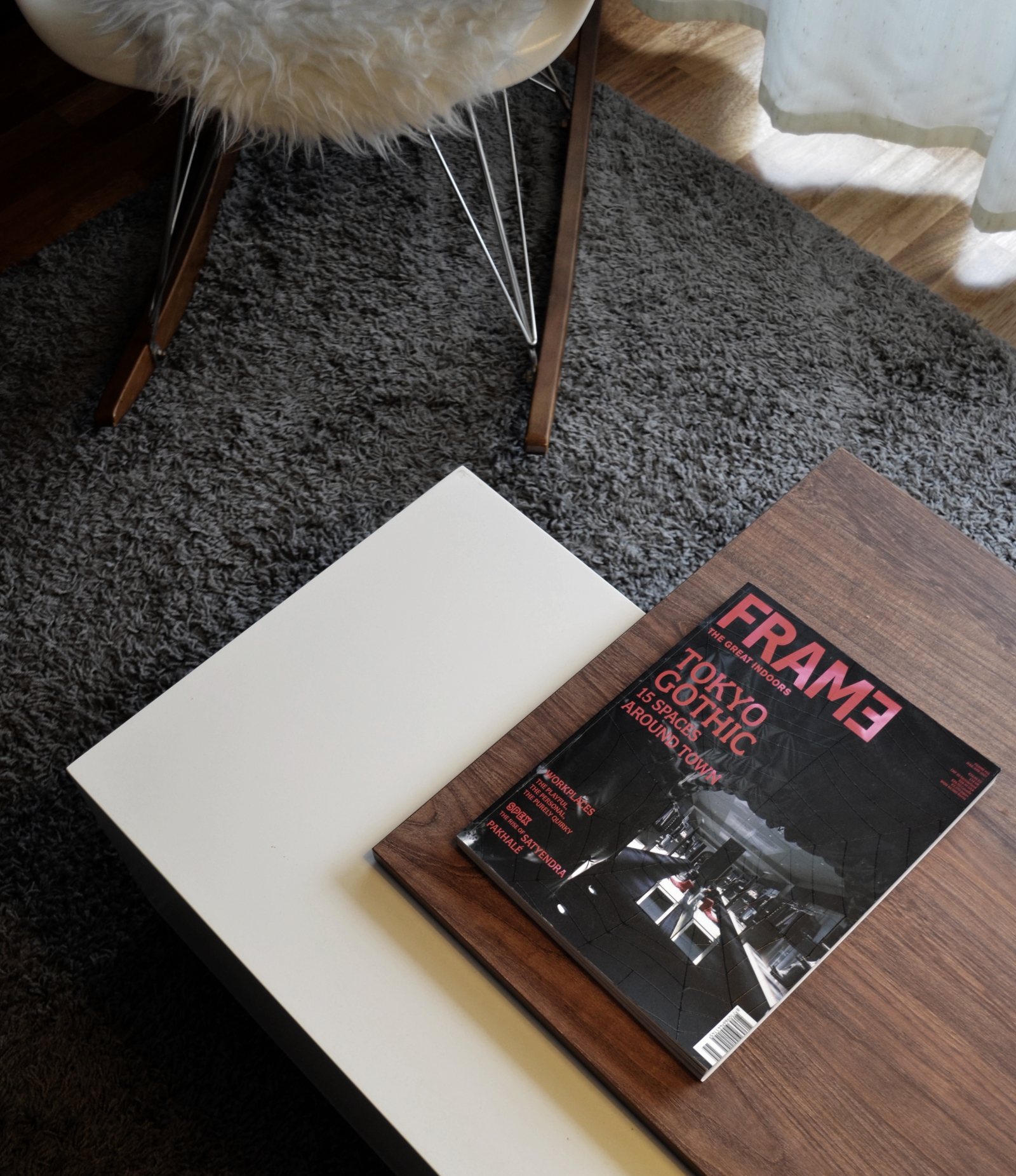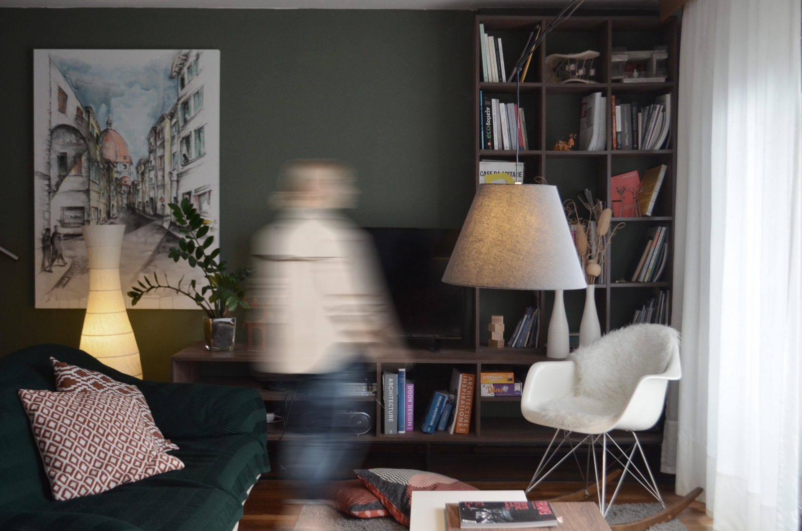 Οι αποχρώσεις που επιλέχθηκαν καλύπτουν την παλέτα φυσικών χρωμάτων όπως το πράσινο λαδί χρώμα για το κεντρικό τοίχο του καθιστικού αλλά και για το κύριο υπνοδωμάτιο, το οποίο ενισχύει την αίσθηση οικειότητας με τον χώρο ενώ για την κουζίνα επιλέχθηκε η απόχρωση του κόκκινου ‘’terracotta’’, το οποίο συνδυάζεται αρμονικά με την θερμή απόχρωση του ξύλου καρυδιάς που επιλέχθηκε για τον πάγκο και τα ντουλάπια της κουζίνας. Αντίθετα, στον χώρο του καθιστικού επιλέχθηκε μια περισσότερο σκουρόχρωμη απόχρωση ξύλου για τα έπιπλα της τραπεζαρίας, του σύνθετου επίπλου της βιβλιοθήκης καθώς και του τραπεζιού του καθιστικού. Τον σχεδιασμό πλαισιώνουν έπιπλα όπως ένα τραπέζι αντίκα του 1960, κατασκευασμένο στο Βελιγράδι αλλά και αντικείμενα σύγχρονου designόπως το αντίγραφο τη διάσημης πολυθρόνας του ομίλου ‘’Vitra’’, ‘’EamesFiberglassArmchair’’ σχεδιασμένη από τους αδελφούς Eamesτο 1954.