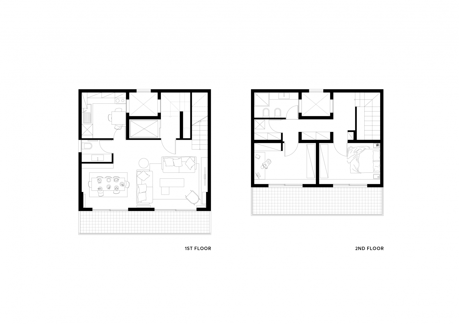 Στο πρώτο επίπεδο τοποθετούνται οι κοινόχρηστοι χώροι του διαμερίσματος, το καθιστικό, η κουζίνα, η τραπεζαρία και ένα WC ενώ στο δεύτερο επίπεδο οι πιο ιδιωτικοί χώροι, όπως το κύριο υπνοδωμάτιο, το δεύτερο υπνοδωμάτιο που χρησιμεύει και ως χώρος εργασίας, το κύριο λουτρό καθώς και χώρος αποθήκης και πλυσταριό.