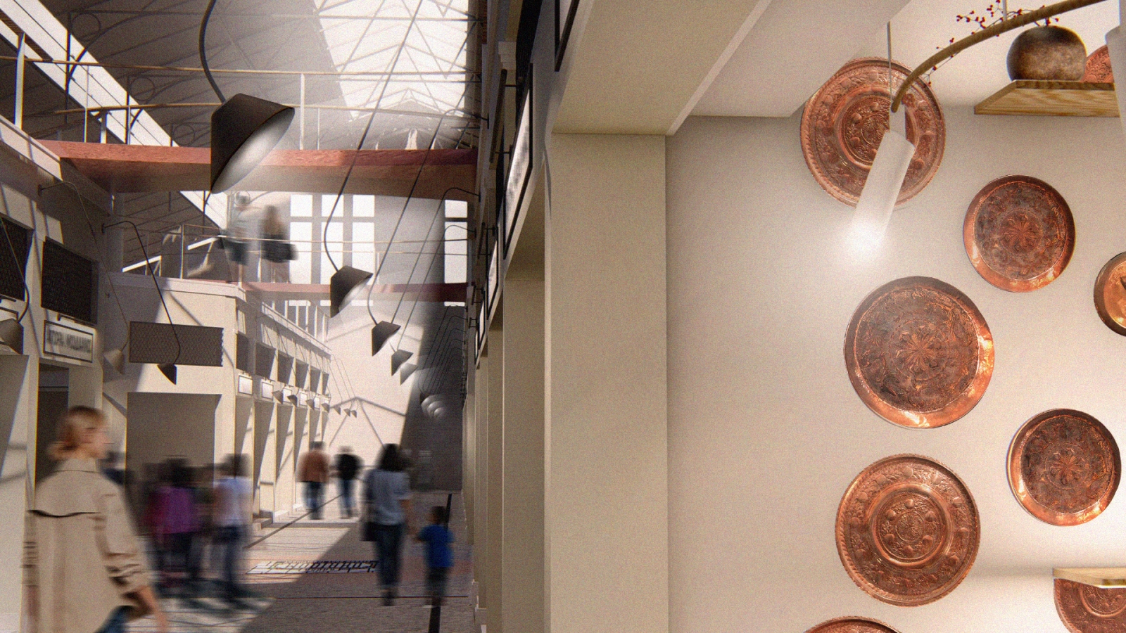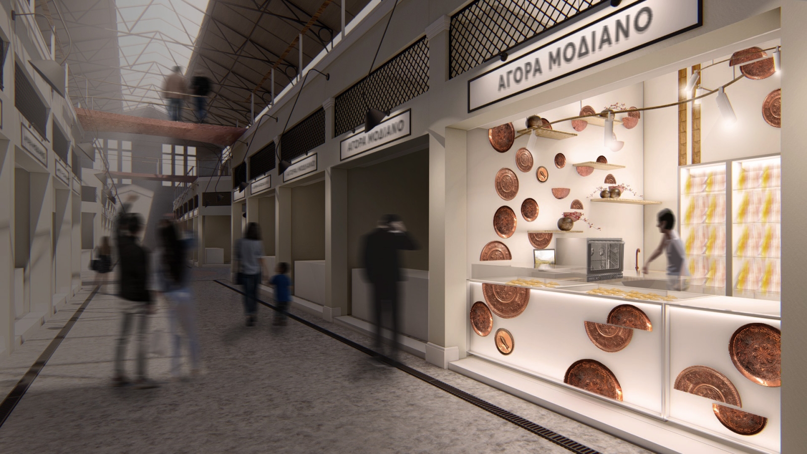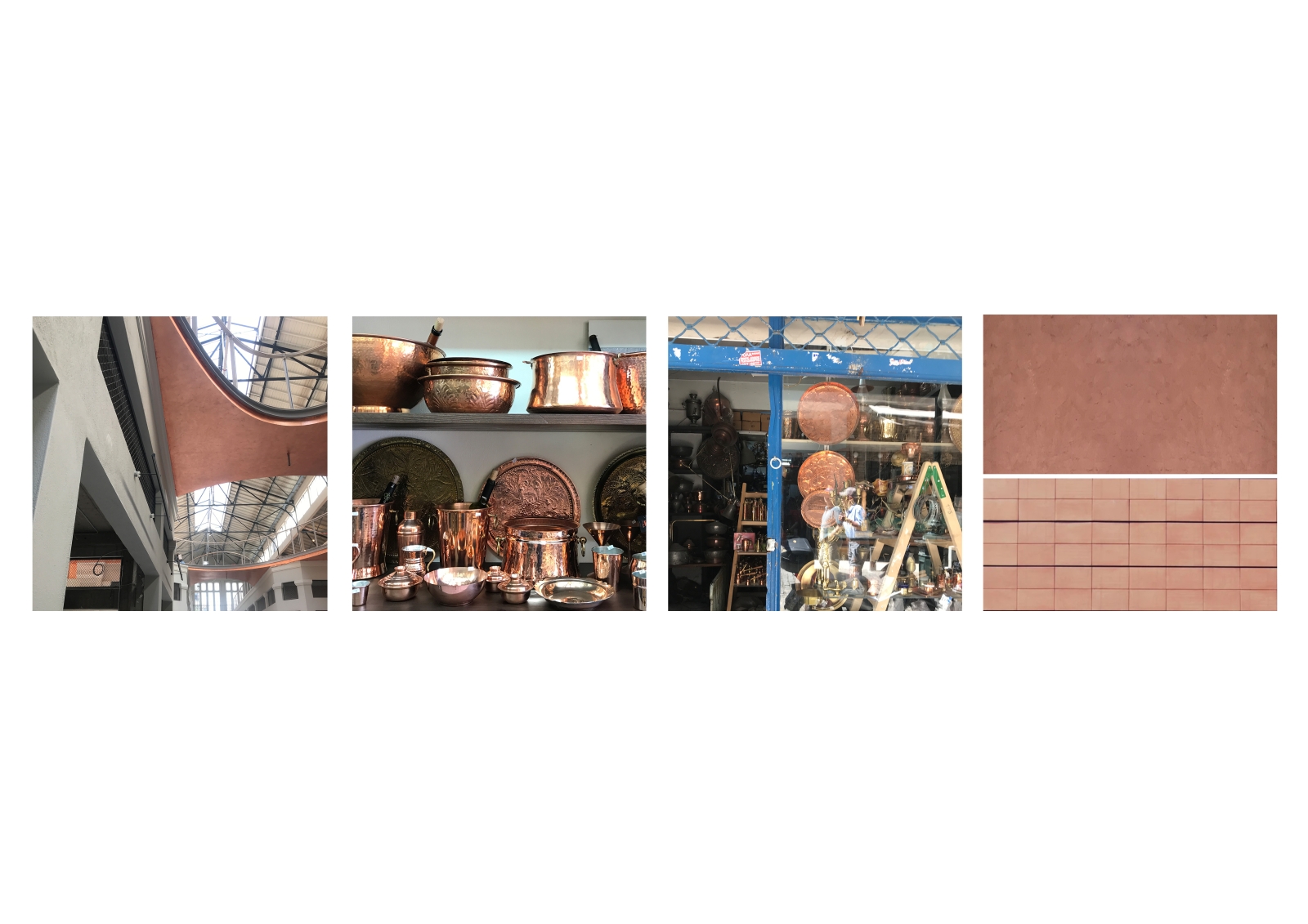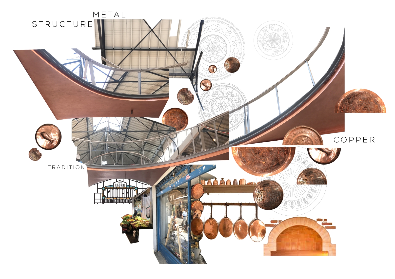 Τα χάλκινα αντικείμενα εμφανίζονται και στην εξωτερική πλευρά του πάγκου, απ’ όπου ‘’ξεκινάει’’ η σύνθεση του κολάζ. Το στοιχείο του χαλκού παρουσιάζεται και στο κυρίαρχο σχεδιαστικό αντικείμενο των ‘γεφυρών’ της νέας Αγοράς Μοδιάνο, δημιουργνώντας, έτσι, έναν ενδιαφέροντα διάλογο μεταξύ Αγοράς και καταστήματος.