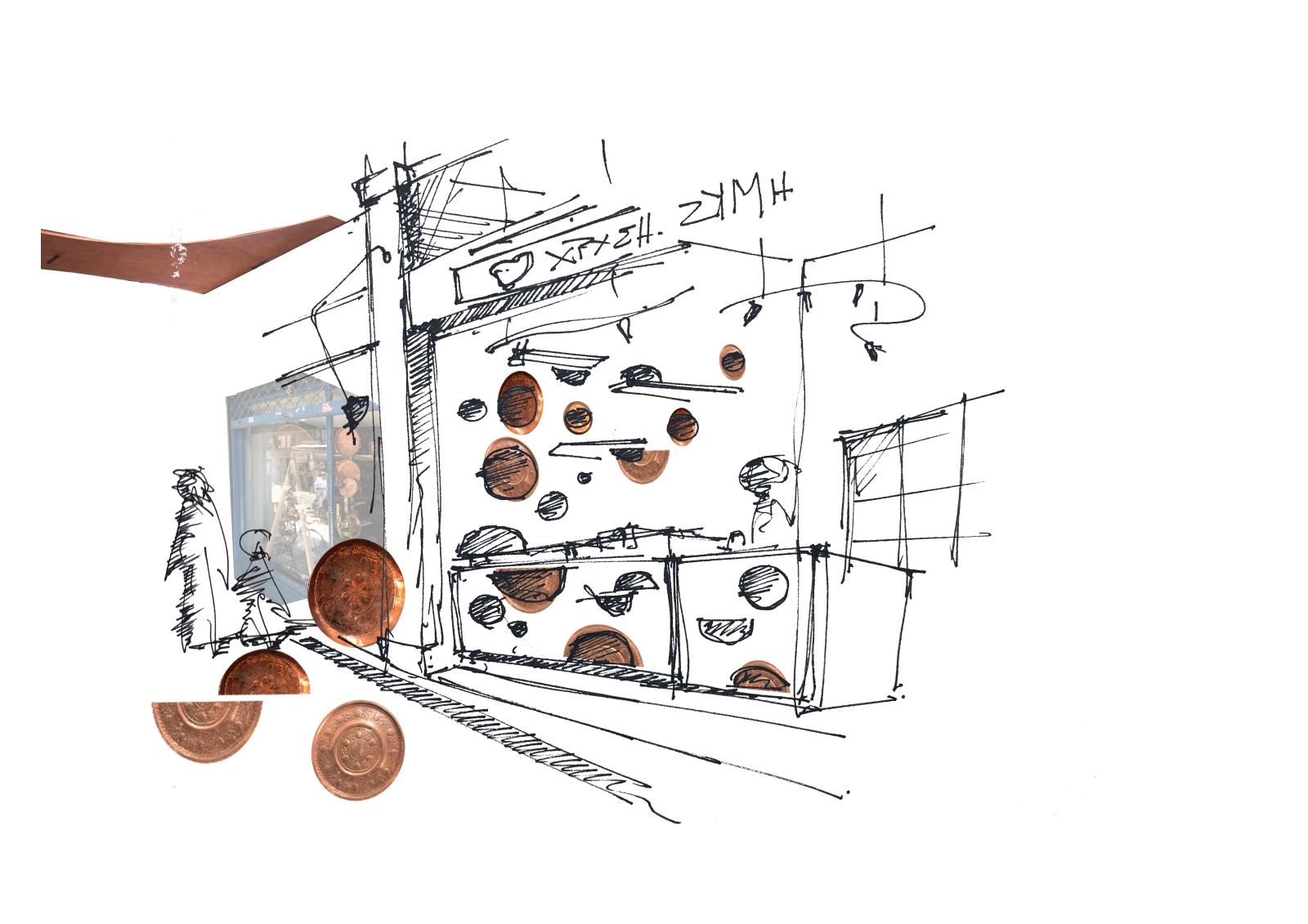 Κομμάτι αυτής της παράδοσης αποτελούν οι χαλκουργοί της περιοχής της Παναγίας Χαλκέων και των ιστορικών στοών και αγορών της πόλης. Σκεύη μαγειρικής, τηγάνια, κατσαρόλες, γουδιά και ταψιά, κατασκευασμένα στο χέρι με περίτεχνα σχέδια μετατρέπονται στο κύριο σχεδιαστικό αντικείμενο του νέου καταστήματος. Τα σκεύη αυτά τοποθετούνται άλλοτε ολόκληρα και άλλοτε ως τμήματα συνθέτοντας ένα σύγχρονο κολάζ, όπου το παραδοσιακό αντικείμενο μιας κουζίνας ή ενός φούρνου εισέρχεται σε έναν μοντέρνο χώρο. Το φυσικό ξύλο στον πάγκο και τα ράφια καθώς και στα κρεμαστά φωτιστικά οροφής ολοκληρώνουν την μελέτη, προσδίδοντας ζεστασιά ενώ διακόπτουν την αυστηρότητα των καθαρών οριζόντιων και κάθετων επιφανειών.