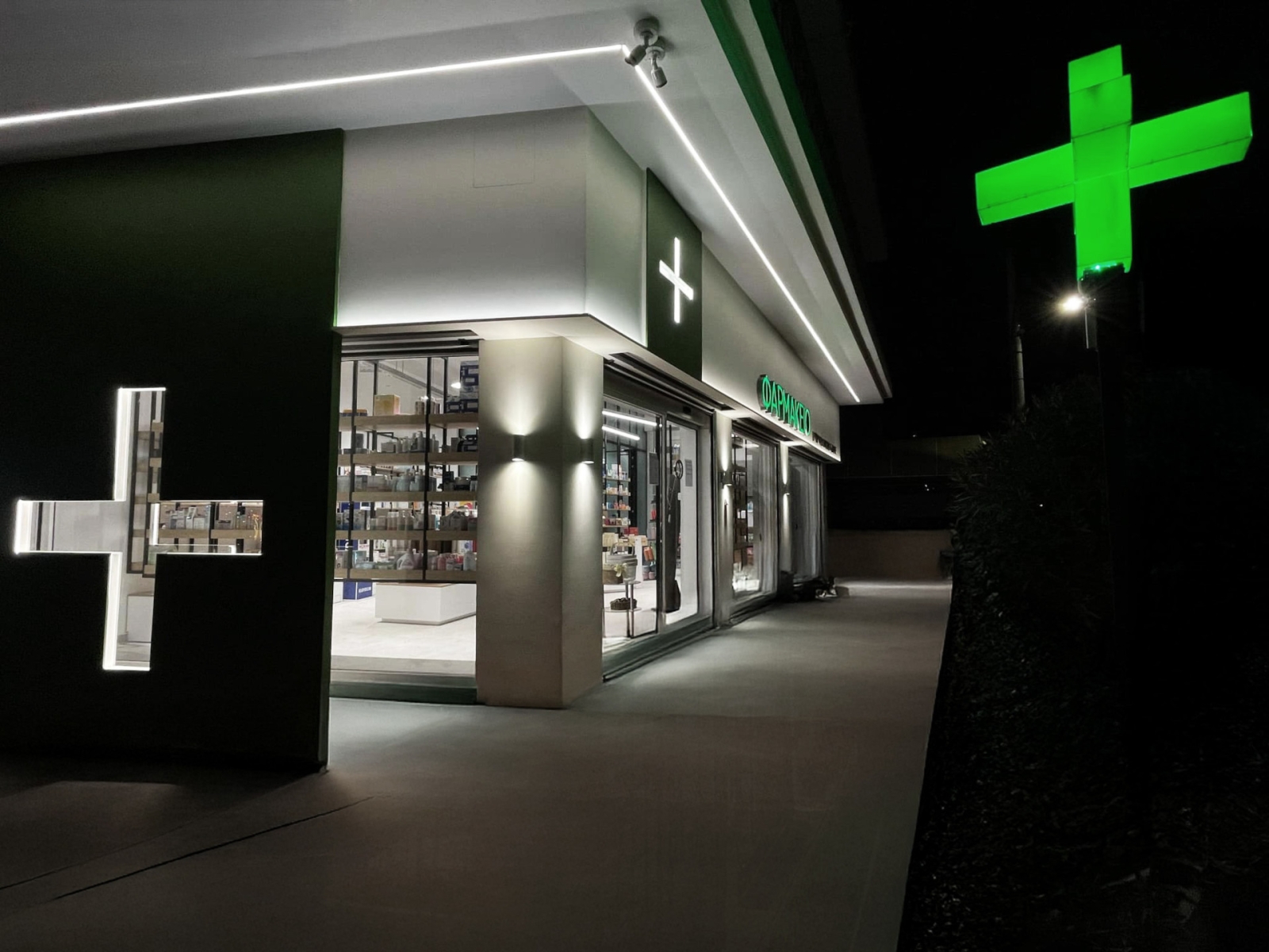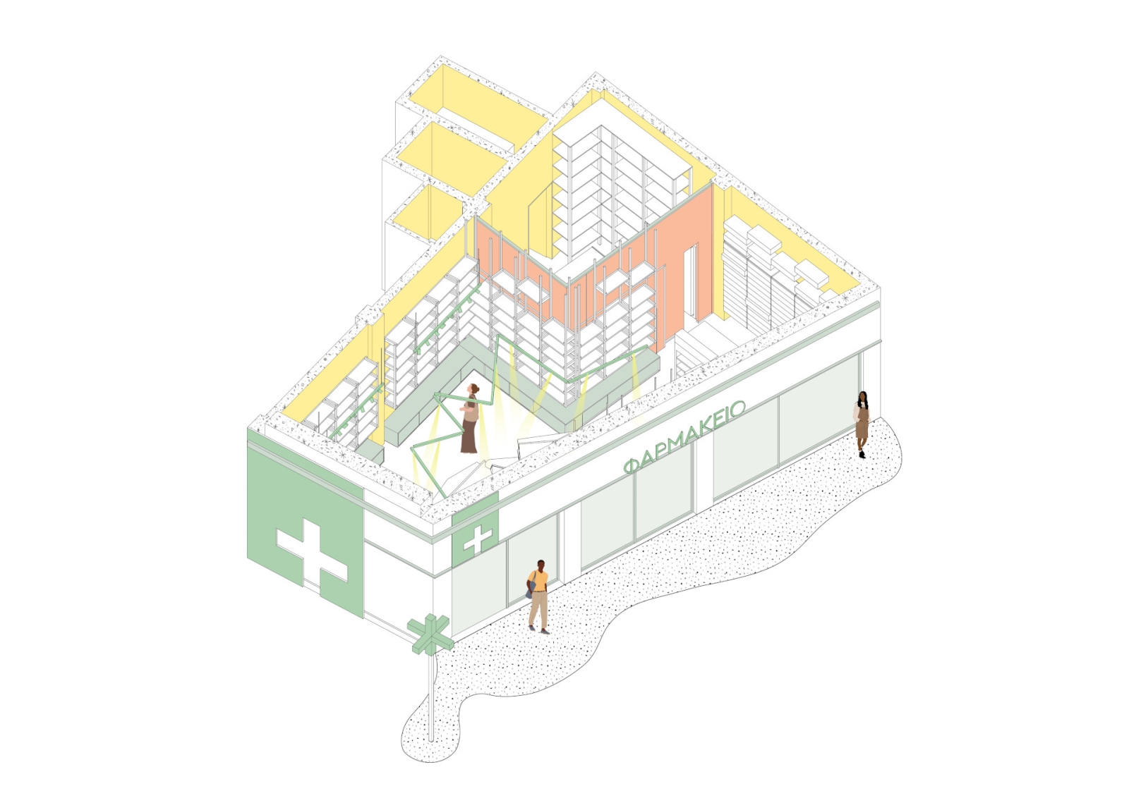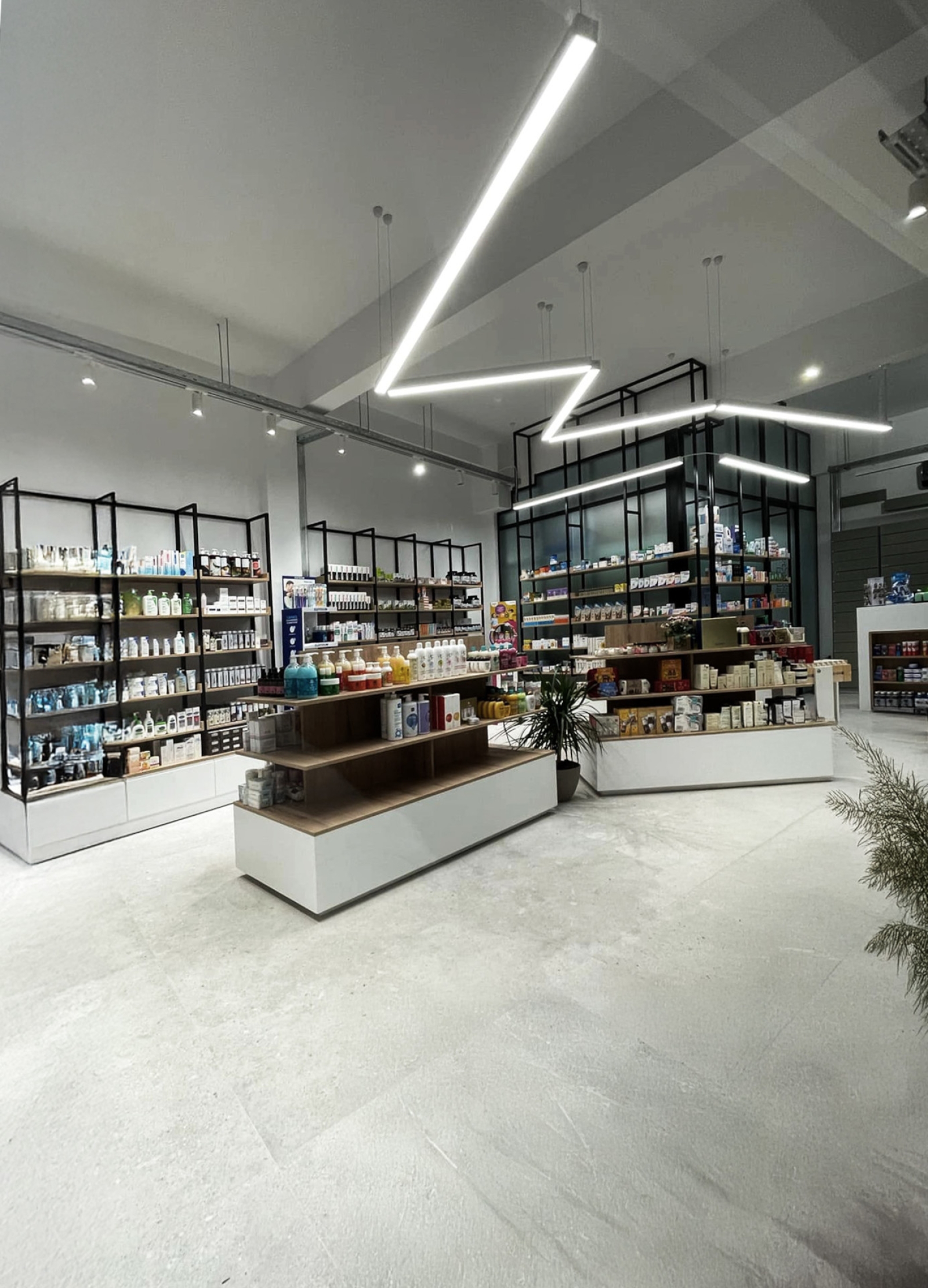 Ο σχεδιασμός του χώρου χαρακτηρίζεται από καθαρές γεωμετρίες και φυσικούς χρωματισμούς, με στόχο την ενίσχυση των συναισθημάτων ηρεμίας και ασφάλειας των επισκεπτών και των ασθενών. Κεντρική αρχιτεκτονική χειρονομία αποτελεί η ιδέα ενός «κουτιού μέσα στο κουτί»: ένας υάλινος όγκος ενσωματώνεται στον κύριο χώρο του φαρμακείου, φιλοξενώντας το εργαστήριο της φαρμακοποιού. Τα αμμοβολημένα υαλοπετάσματα επιτρέπουν τη διάχυση φυσικού φωτός στο εσωτερικό του εργαστηρίου, χωρίς ωστόσο να απομονώνουν τον χώρο υποδοχής. Τα ράφια των προϊόντων αναρτώνται από την οροφή, προσφέροντας ελευθερία κινήσεων και αίσθηση ρευστότητας στον εσωτερικό χώρο.