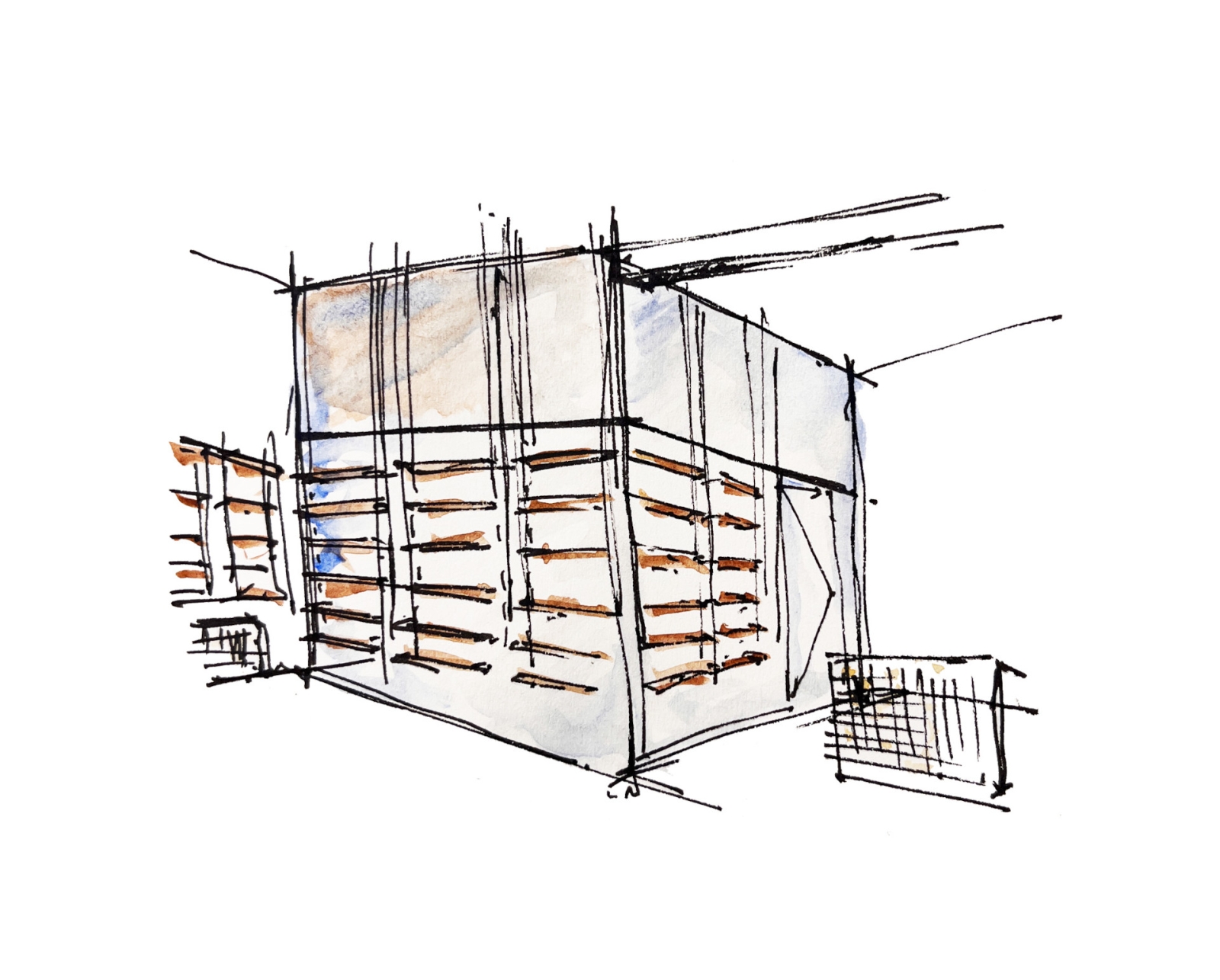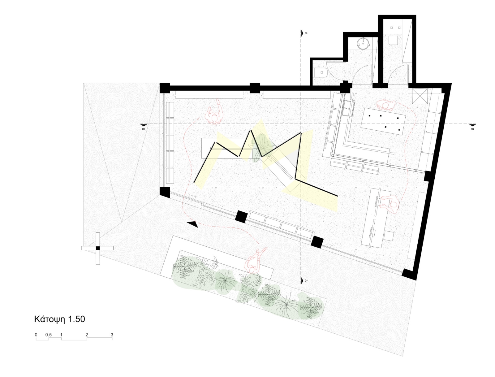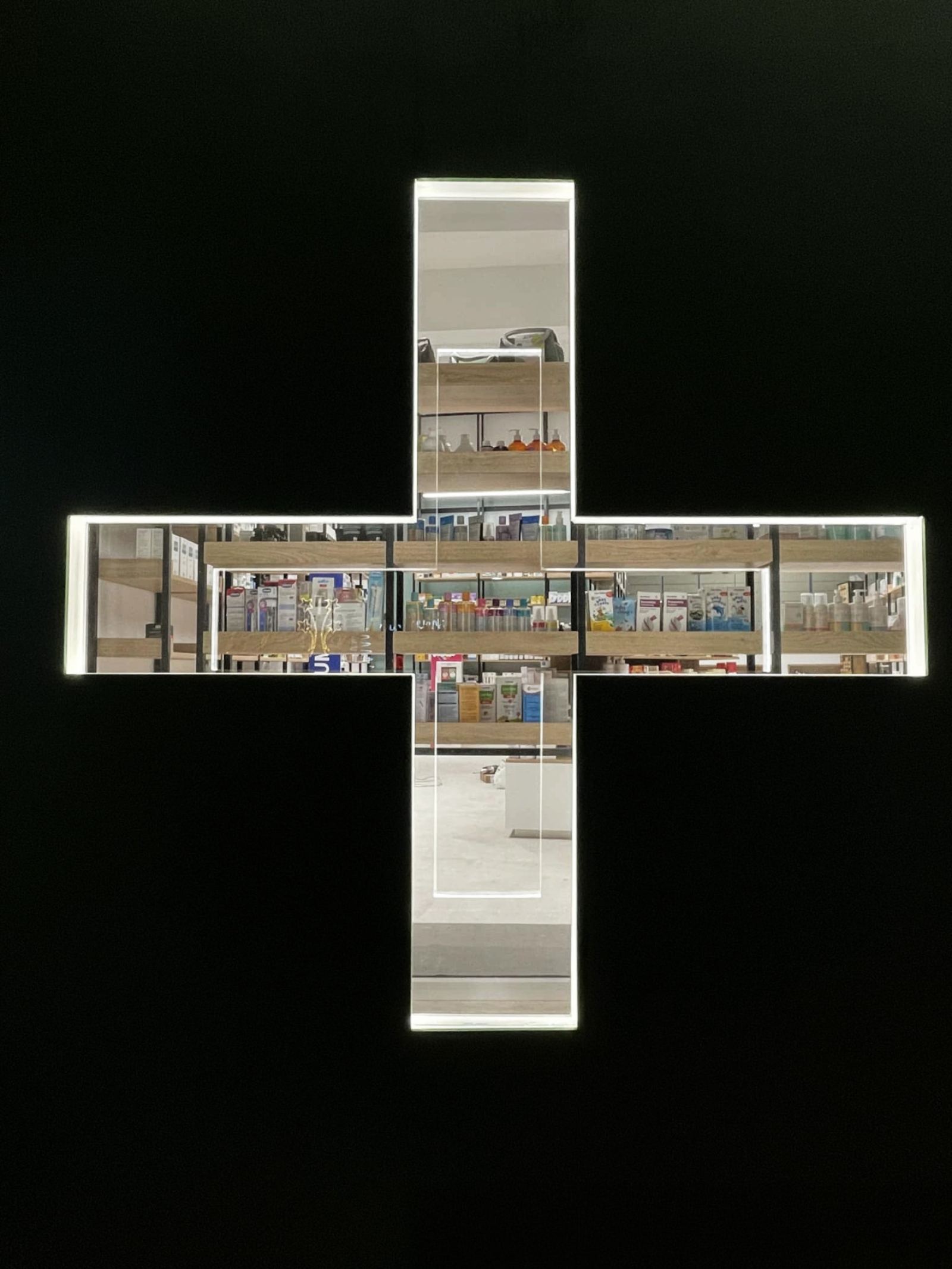 Ο σχεδιασμός του χώρου χαρακτηρίζεται από καθαρές γεωμετρίες και φυσικούς χρωματισμούς, με στόχο την ενίσχυση των συναισθημάτων ηρεμίας και ασφάλειας των επισκεπτών και των ασθενών. Κεντρική αρχιτεκτονική χειρονομία αποτελεί η ιδέα ενός «κουτιού μέσα στο κουτί»: ένας υάλινος όγκος ενσωματώνεται στον κύριο χώρο του φαρμακείου, φιλοξενώντας το εργαστήριο της φαρμακοποιού. Τα αμμοβολημένα υαλοπετάσματα επιτρέπουν τη διάχυση φυσικού φωτός στο εσωτερικό του εργαστηρίου, χωρίς ωστόσο να απομονώνουν τον χώρο υποδοχής. Τα ράφια των προϊόντων αναρτώνται από την οροφή, προσφέροντας ελευθερία κινήσεων και αίσθηση ρευστότητας στον εσωτερικό χώρο.