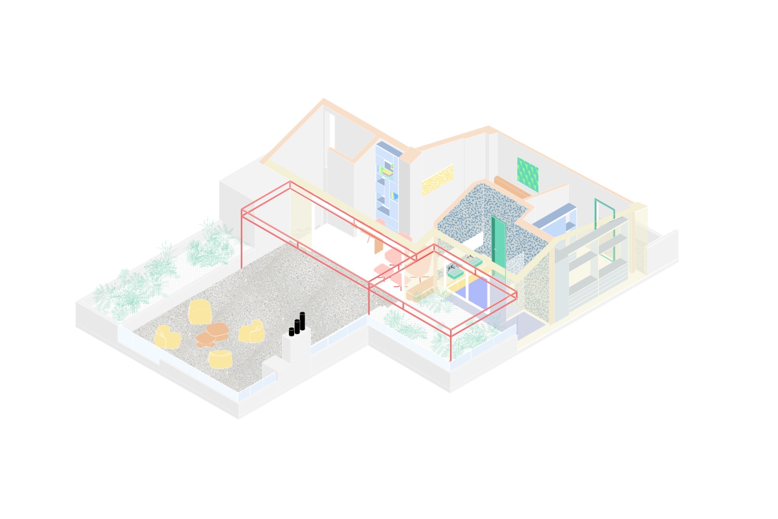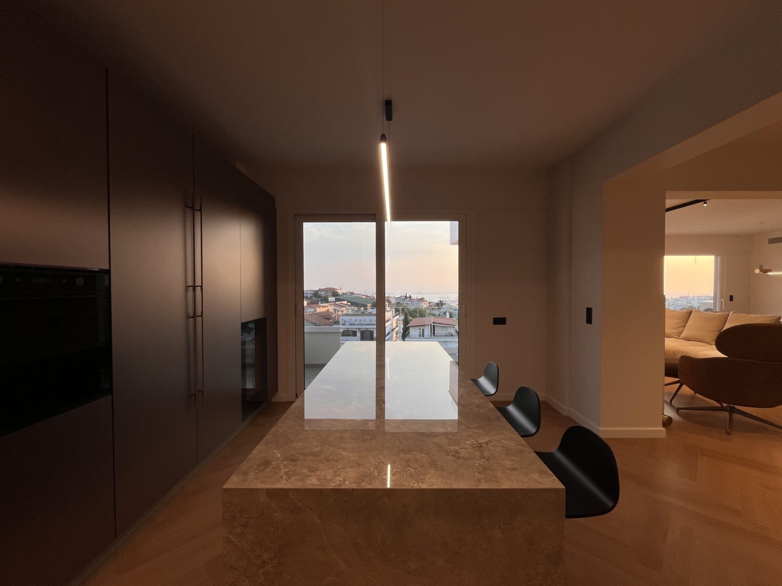 Το διαμέρισμα, συνολικής επιφάνειας 200 τ.μ., βρίσκεται σε προνομιακό σημείο της Θεσσαλονίκης, με πανοραμική θέα προς τον Θερμαϊκό Κόλπο, το Επταπύργιο και τον Όλυμπο. Αναπτύσσεται σε δύο επίπεδα: στον πρώτο όροφο τοποθετούνται οι κοινόχρηστοι χώροι της οικογένειας — το σαλόνι με την τραπεζαρία για οκτώ άτομα, η ανοιχτή κουζίνα, το WC επισκεπτών και τα δύο παιδικά υπνοδωμάτια. Στον επάνω όροφο διαμορφώνεται το κύριο υπνοδωμάτιο του ζευγαριού, συνοδευόμενο από βεστιάριο και ιδιωτικό λουτρό.