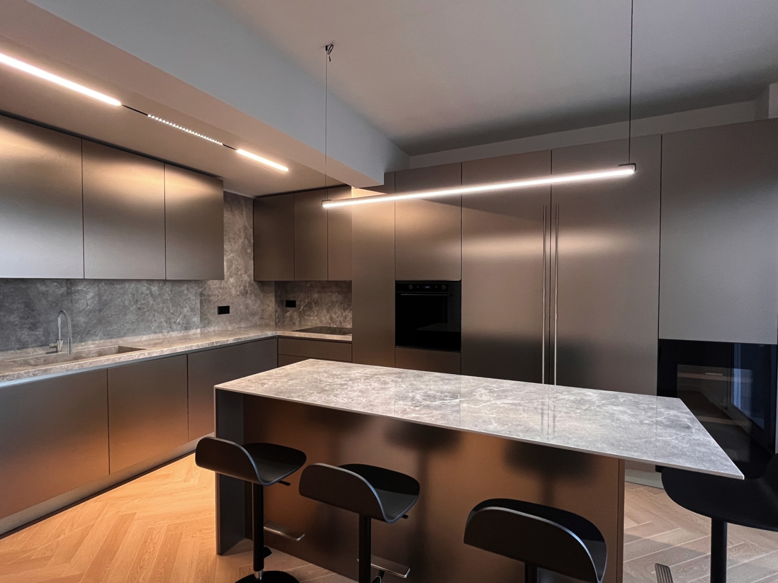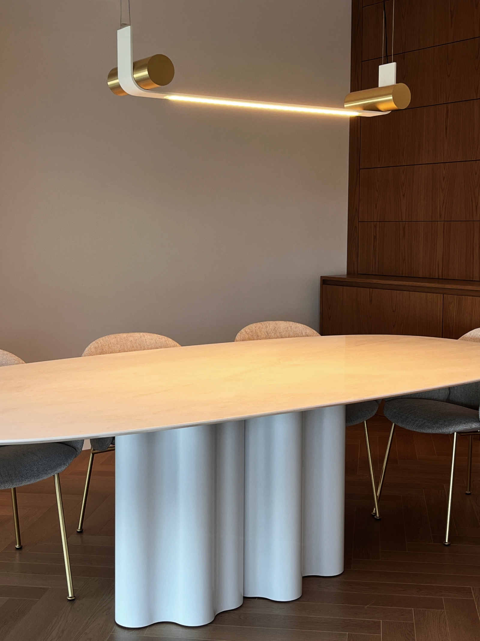 Ο σχεδιασμός βασίστηκε στη χρήση φυσικών και εκλεπτυσμένων υλικών. Το ξύλινο δάπεδο εκτείνεται σε όλη την επιφάνεια του διαμερίσματος, συνδυαζόμενο με inox λεπτομέρειες, επιφάνειες λευκού μαρμάρου και επιλεγμένα έπιπλα υψηλής αισθητικής από οίκους όπως οι Saba Italia, Kristalia, Ditre Italia και Stosa Cucine.