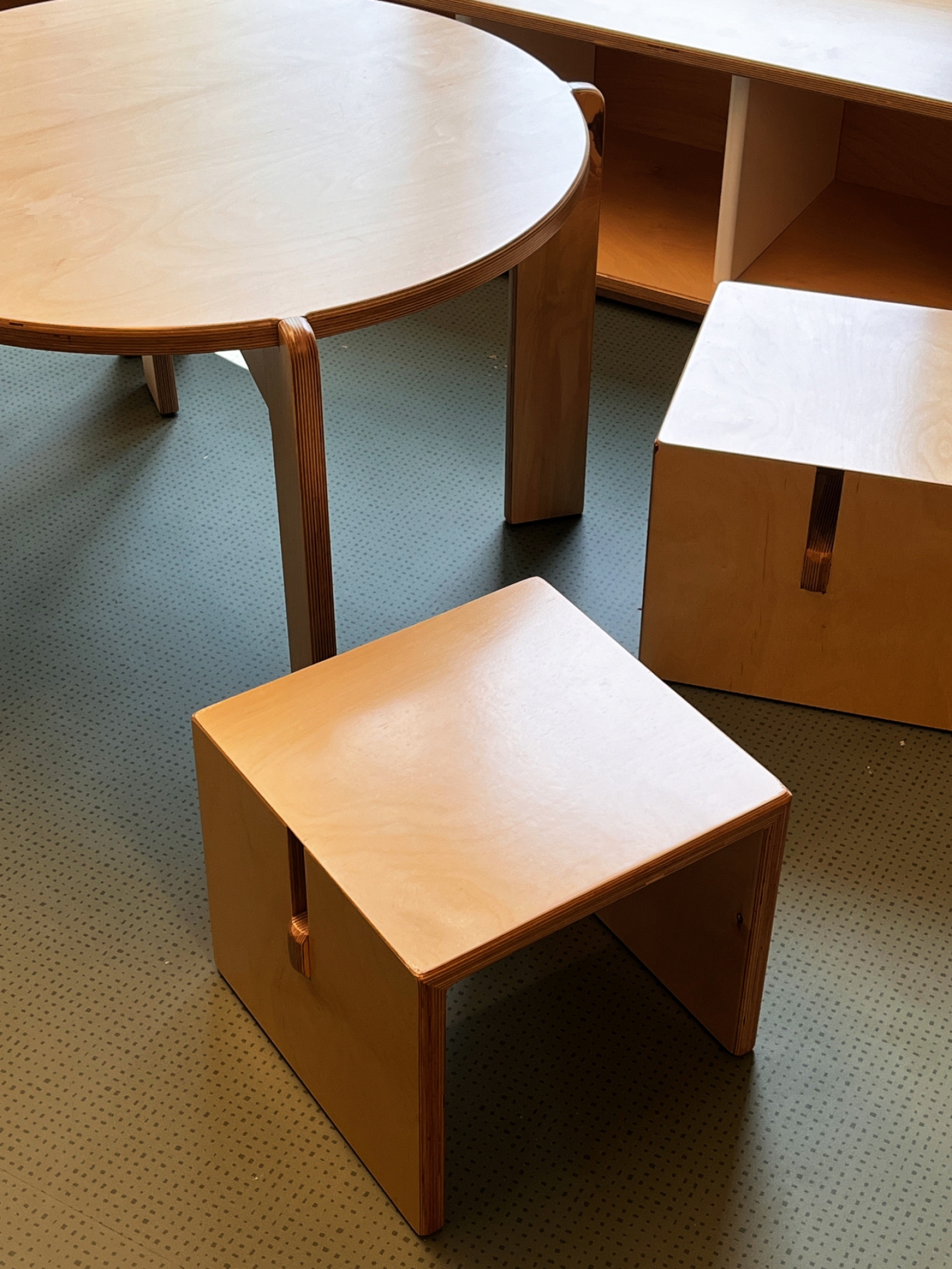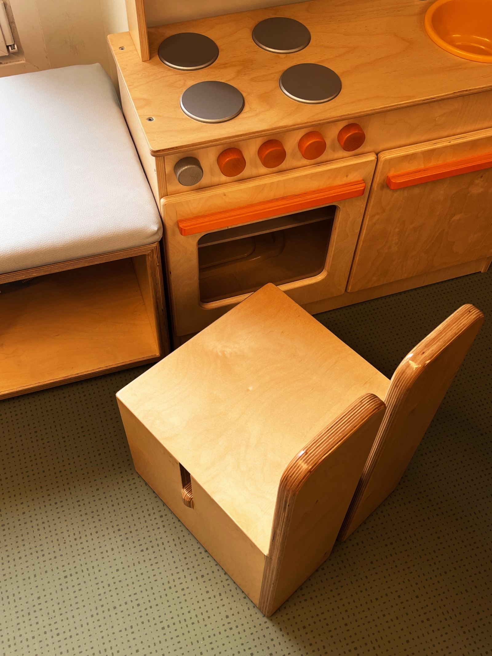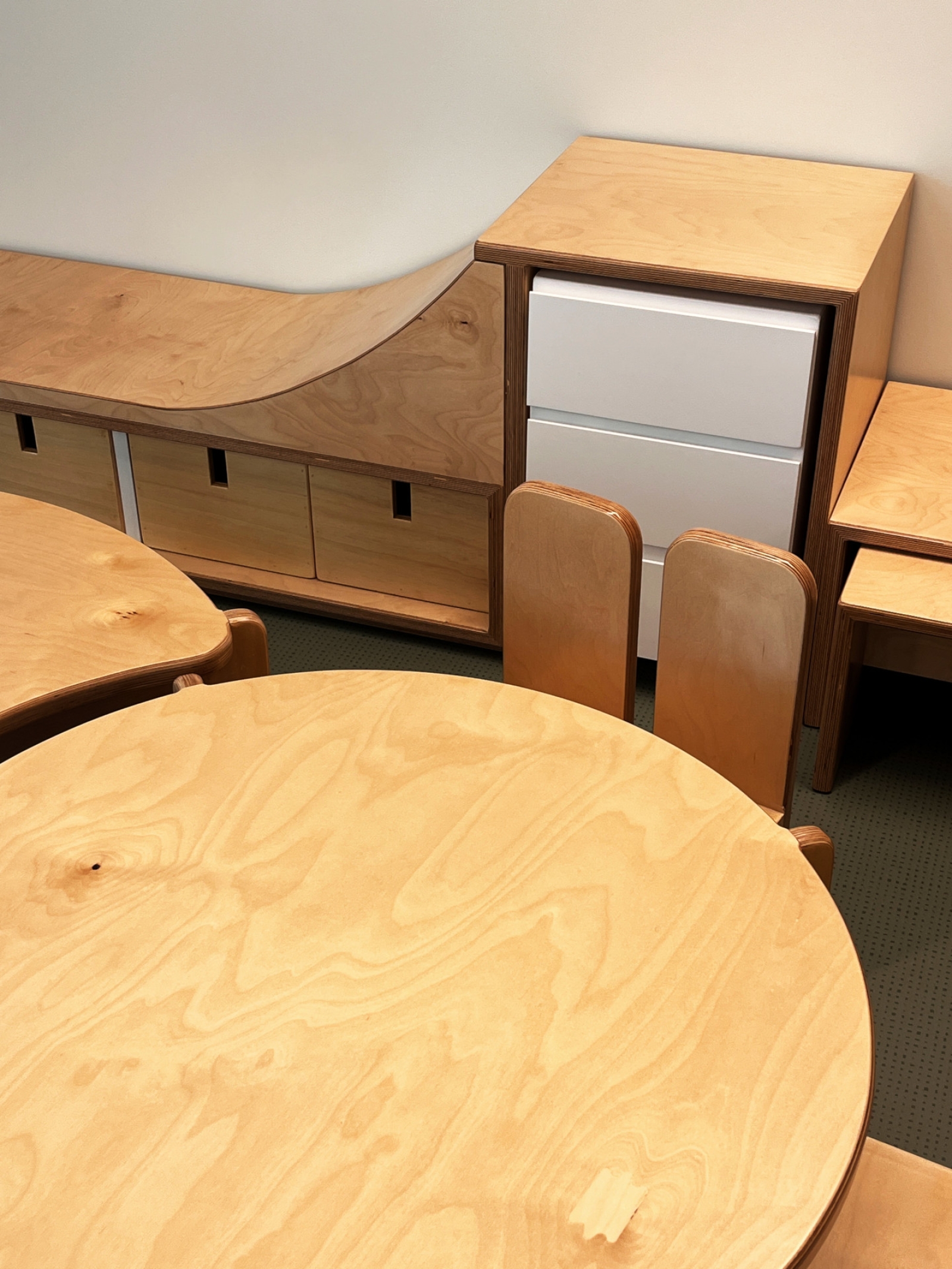 Κύρια στοιχεία του σχεδιασμού αποτελούν το πολύχρωμο δάπεδο υψηλής αντοχής και ασφάλειας, κατάλληλο για χρήση από μικρά παιδιά, τα μεγάλα ανοίγματα που επιτρέπουν τη διάχυση φυσικού φωτός και εξασφαλίζουν άμεση οπτική και λειτουργική σχέση με τη μεγάλη αυλή, καθώς και η χρήση σουηδικού κόντρα πλακέ θαλάσσης σε όλα τα έπιπλα του εσωτερικού, τα οποία σχεδιάστηκαν ειδικά για τις ανάγκες και την εργονομία των παιδιών.