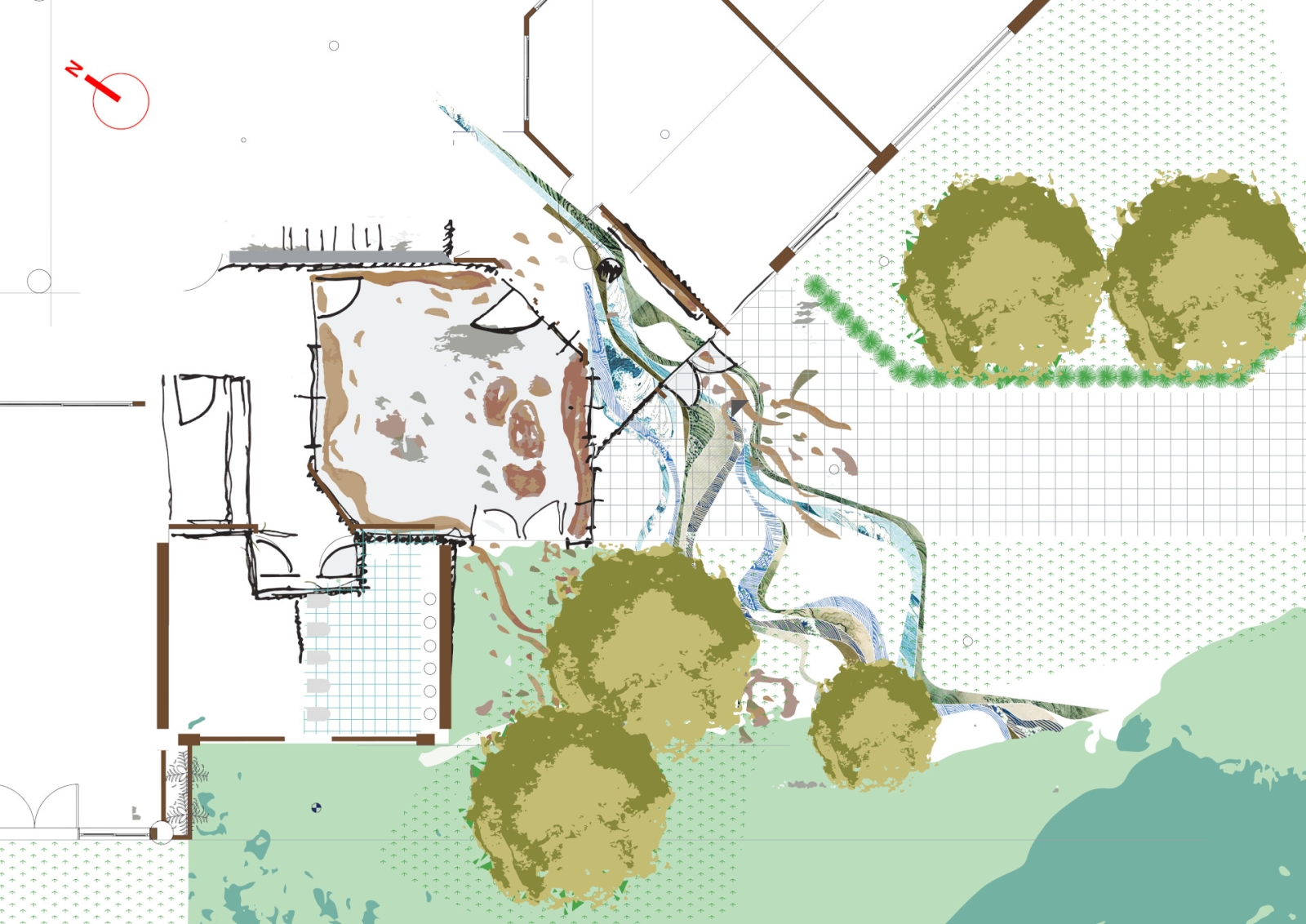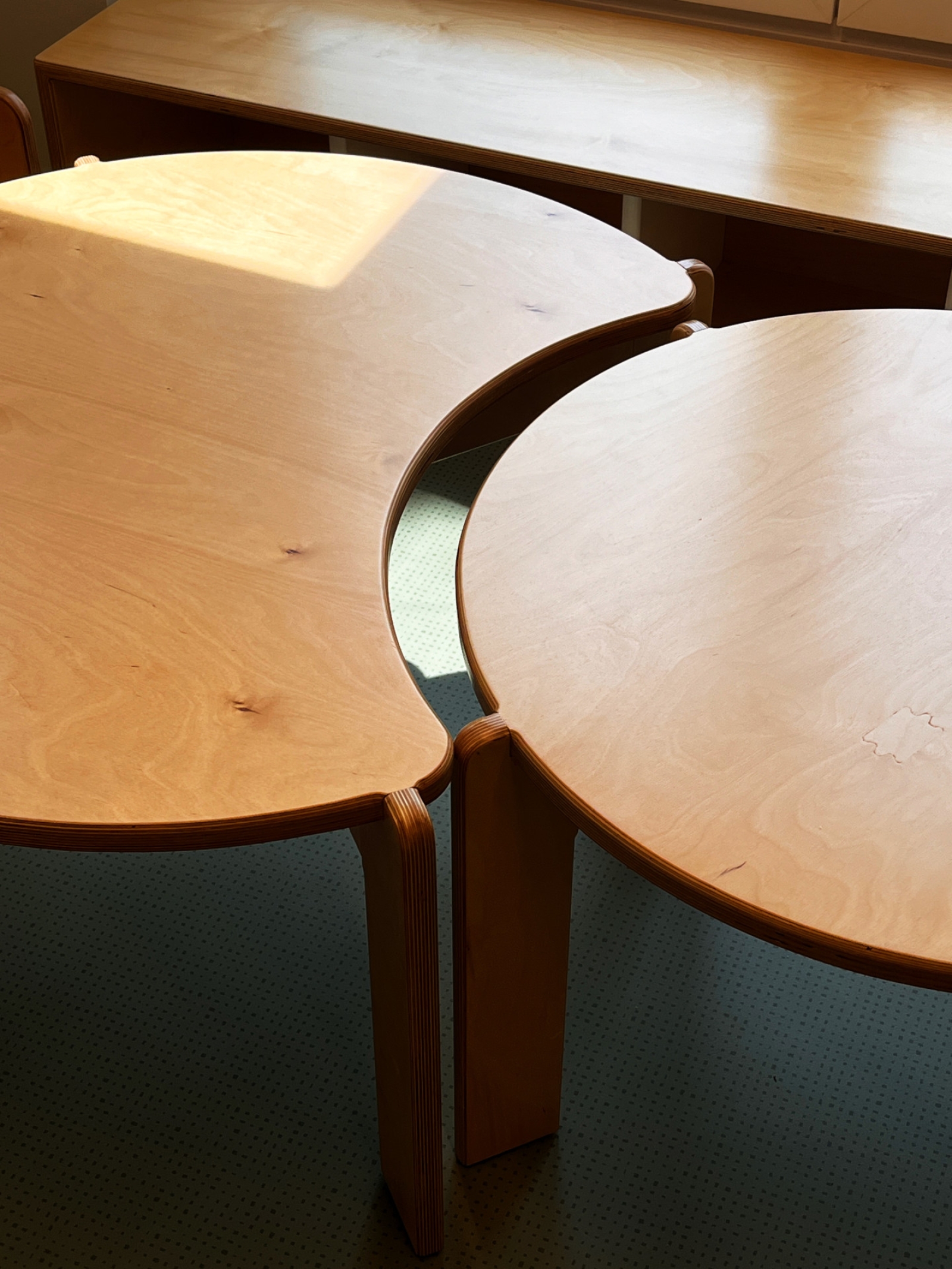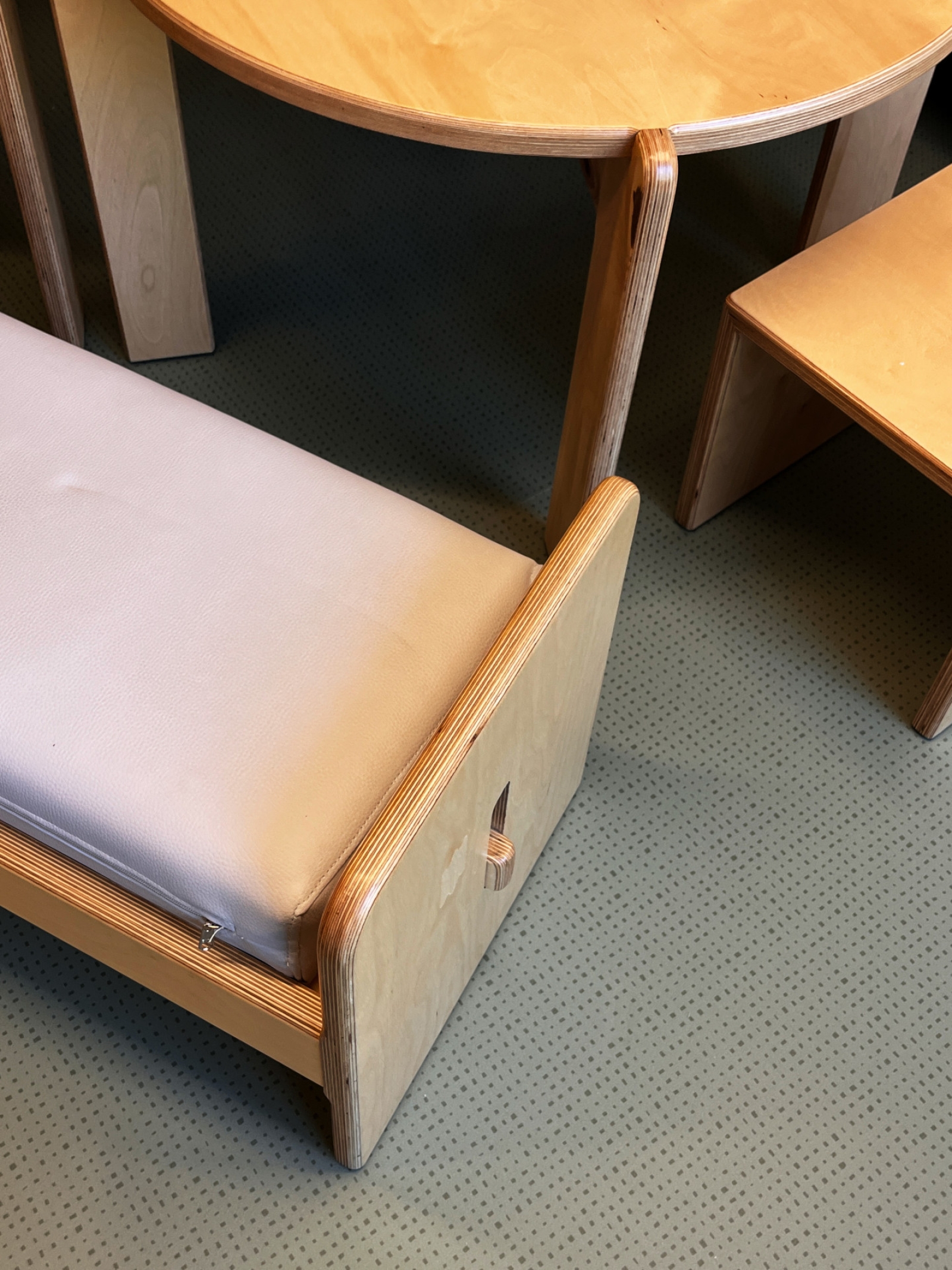 Κύρια στοιχεία του σχεδιασμού αποτελούν το πολύχρωμο δάπεδο υψηλής αντοχής και ασφάλειας, κατάλληλο για χρήση από μικρά παιδιά, τα μεγάλα ανοίγματα που επιτρέπουν τη διάχυση φυσικού φωτός και εξασφαλίζουν άμεση οπτική και λειτουργική σχέση με τη μεγάλη αυλή, καθώς και η χρήση σουηδικού κόντρα πλακέ θαλάσσης σε όλα τα έπιπλα του εσωτερικού, τα οποία σχεδιάστηκαν ειδικά για τις ανάγκες και την εργονομία των παιδιών.