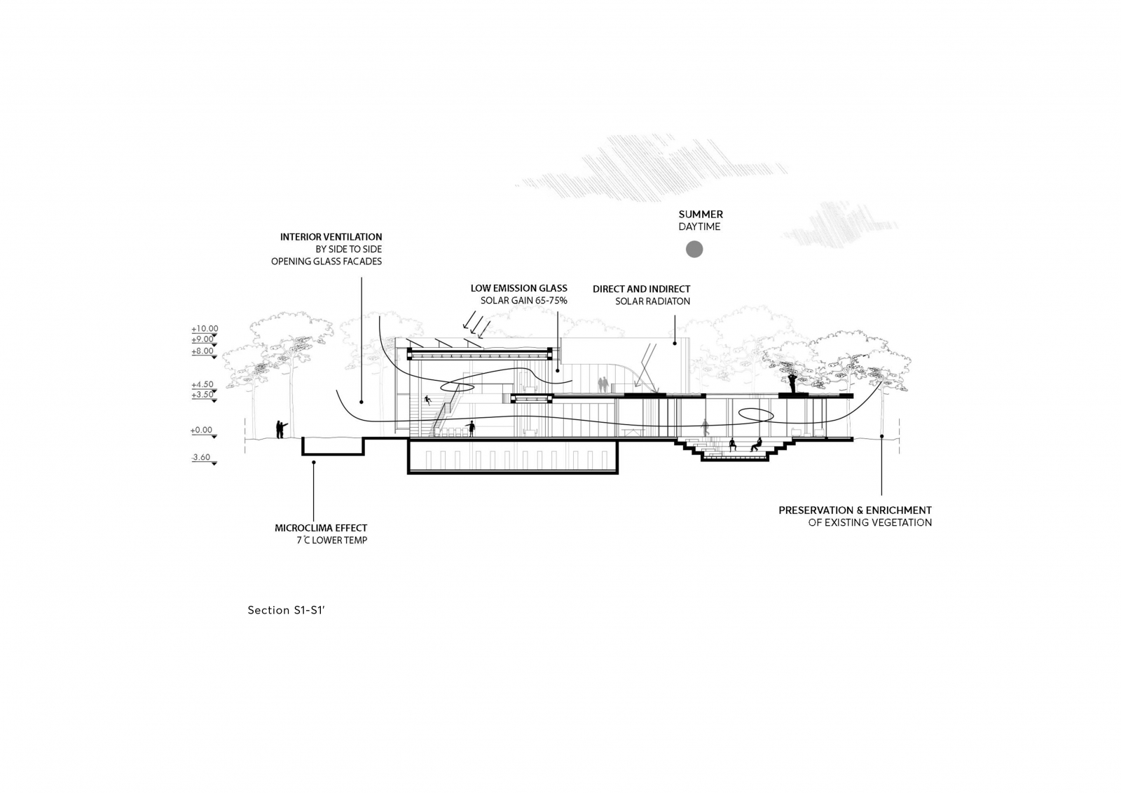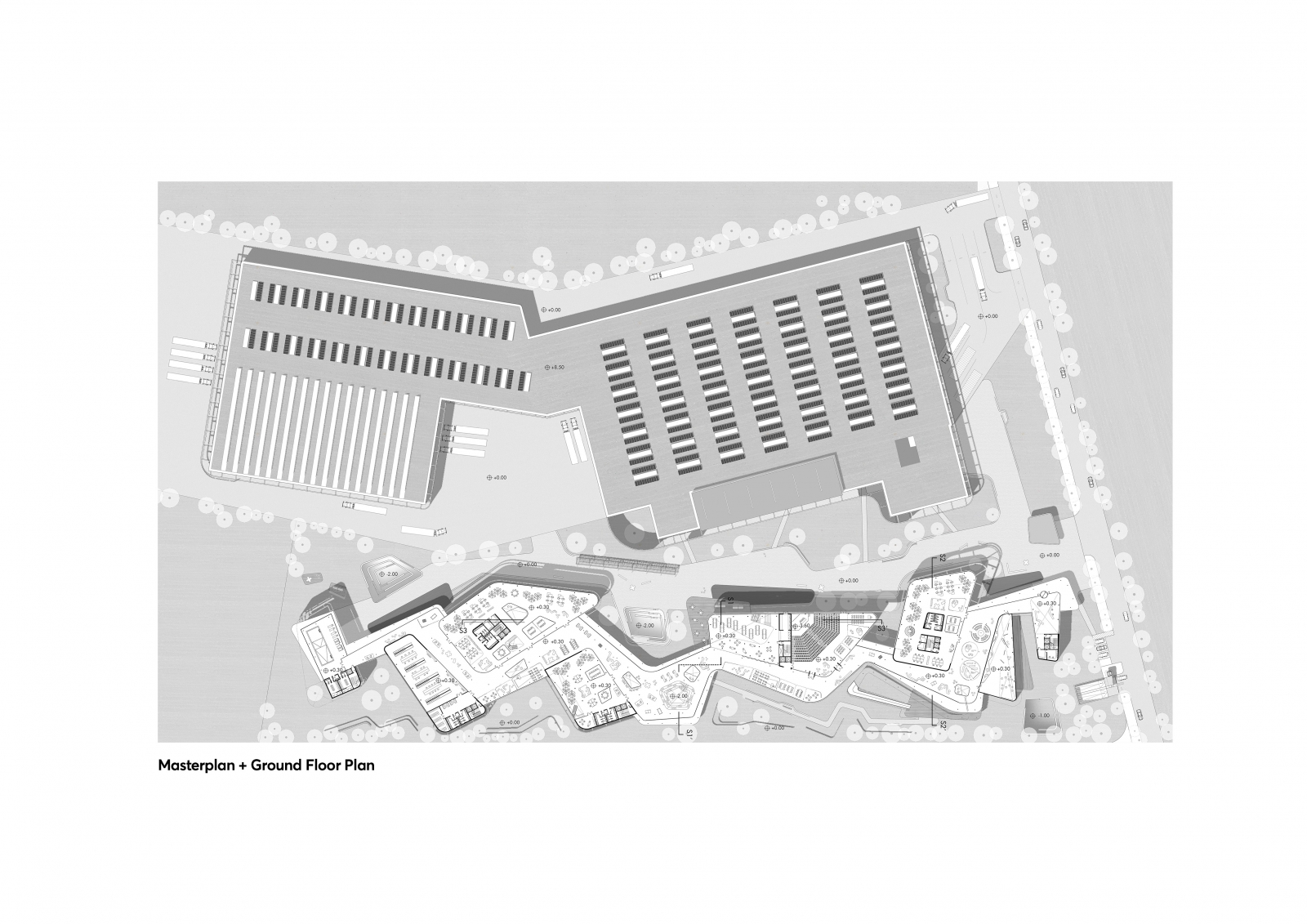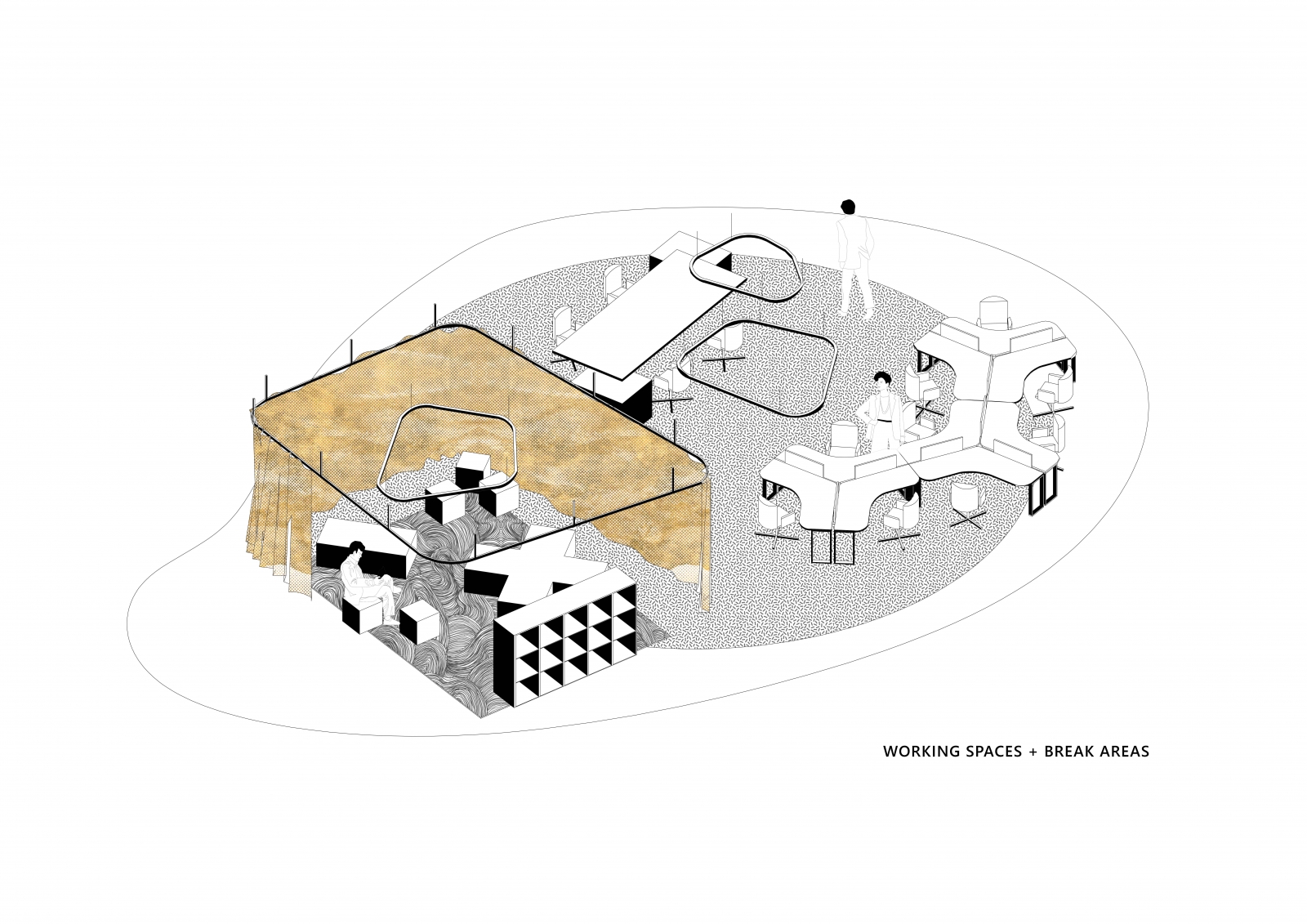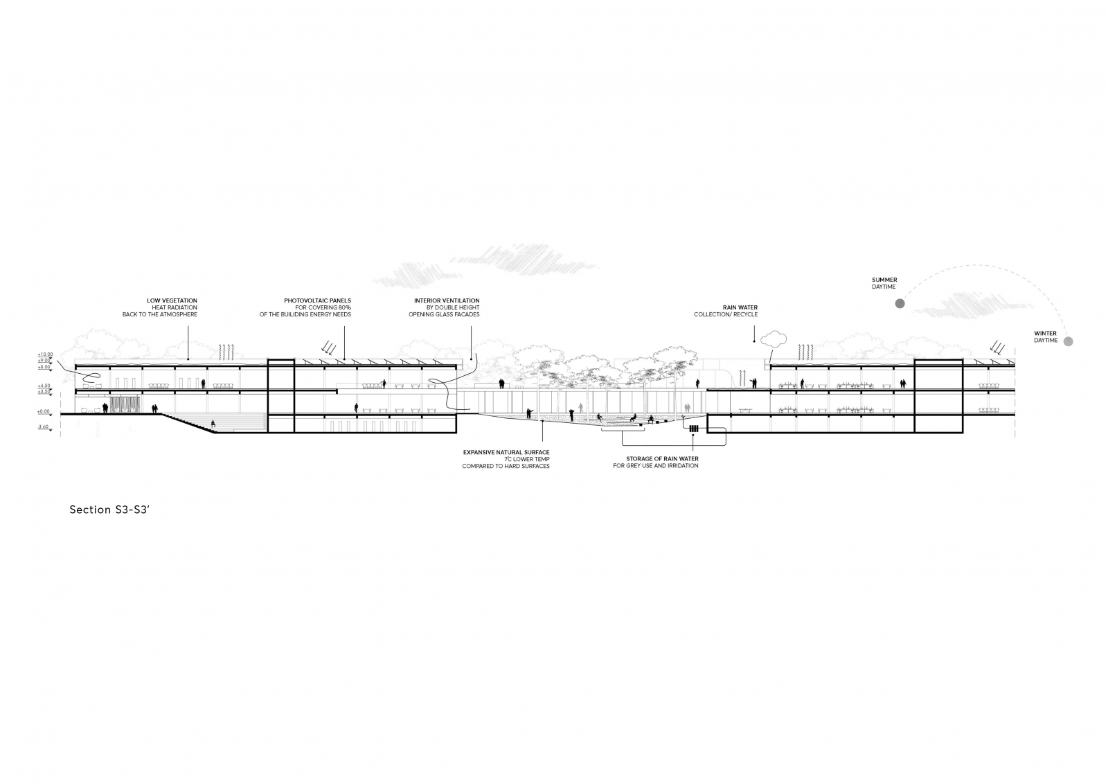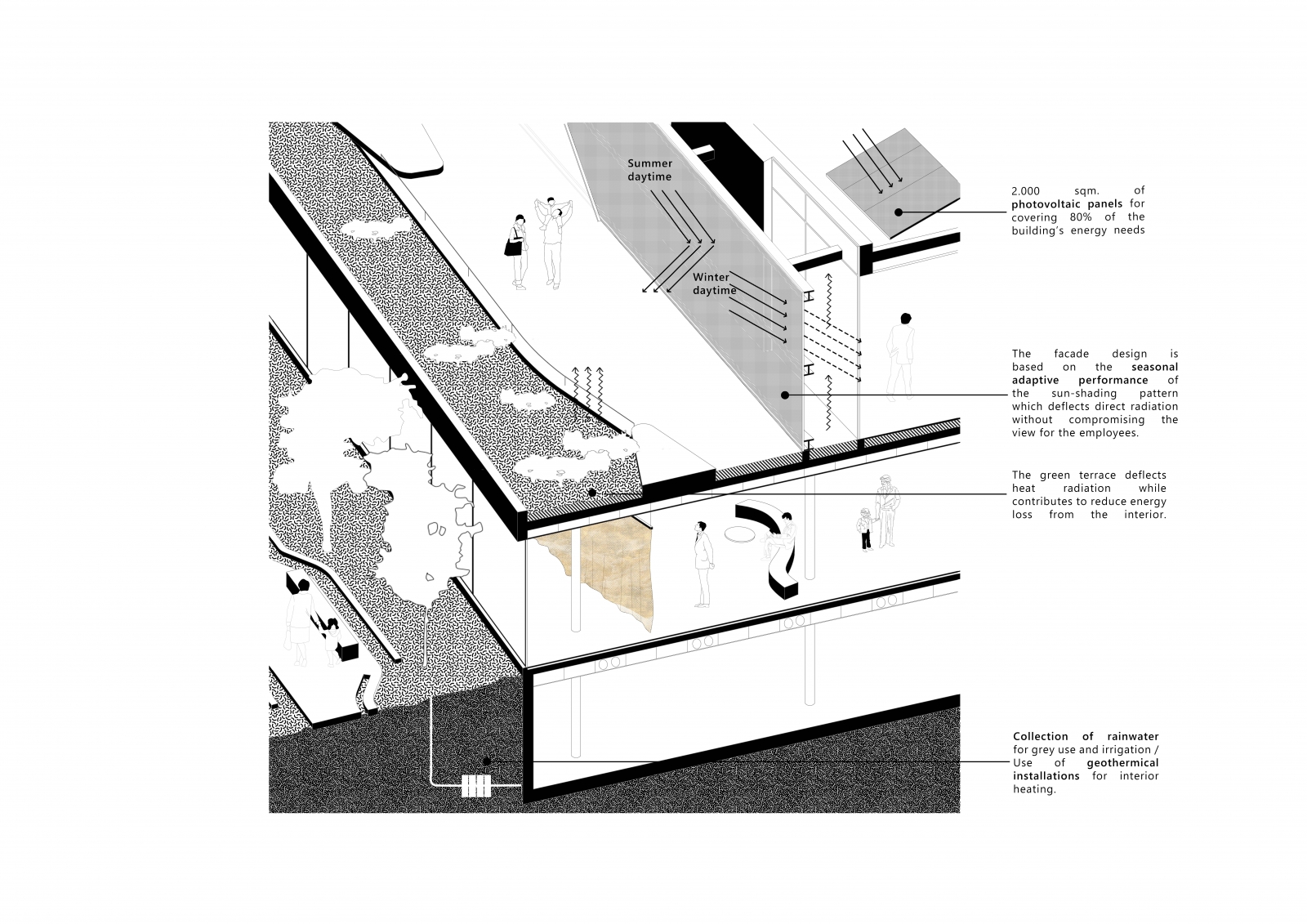 The act of a continuous and curvilinear line formulates a space, a path that crosses the site from the north towards the south. This path is becoming the reference point of the proposal, hosting all public uses of the building, aiming to reinforce the local society and offer the opportunity for communication and interaction between employees from different departments or among visitors.