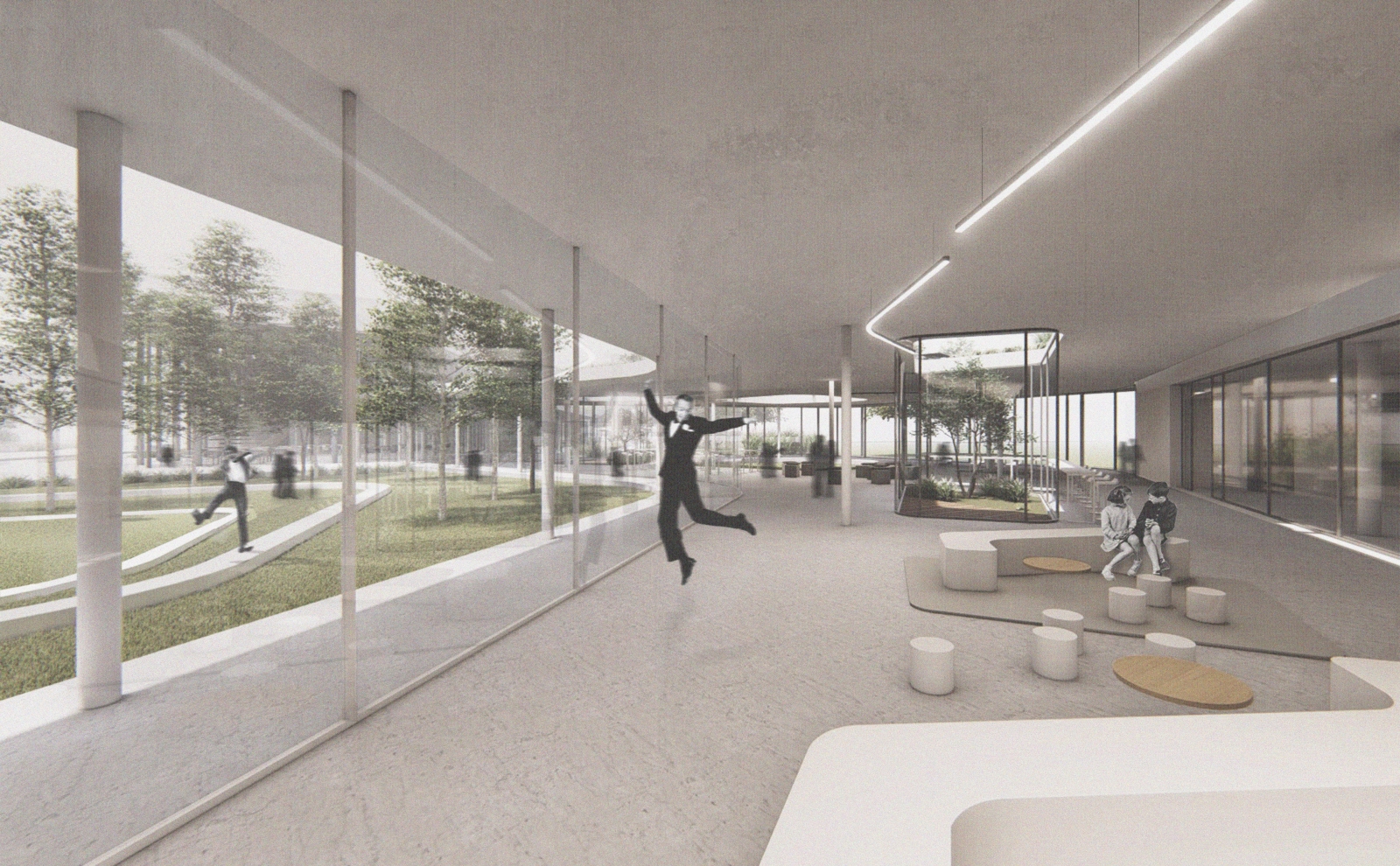 The path is changing its direction, size, and orientation in order to host the movement of employees and visitors together with public and communal uses such as recreational spaces, meeting areas, presentation rooms, multipurpose spaces, relaxation spots, playgrounds, etc. The plasticity of its design permits multiple flows introducing the building more as an open public institution rather than a strictly administrative building.
