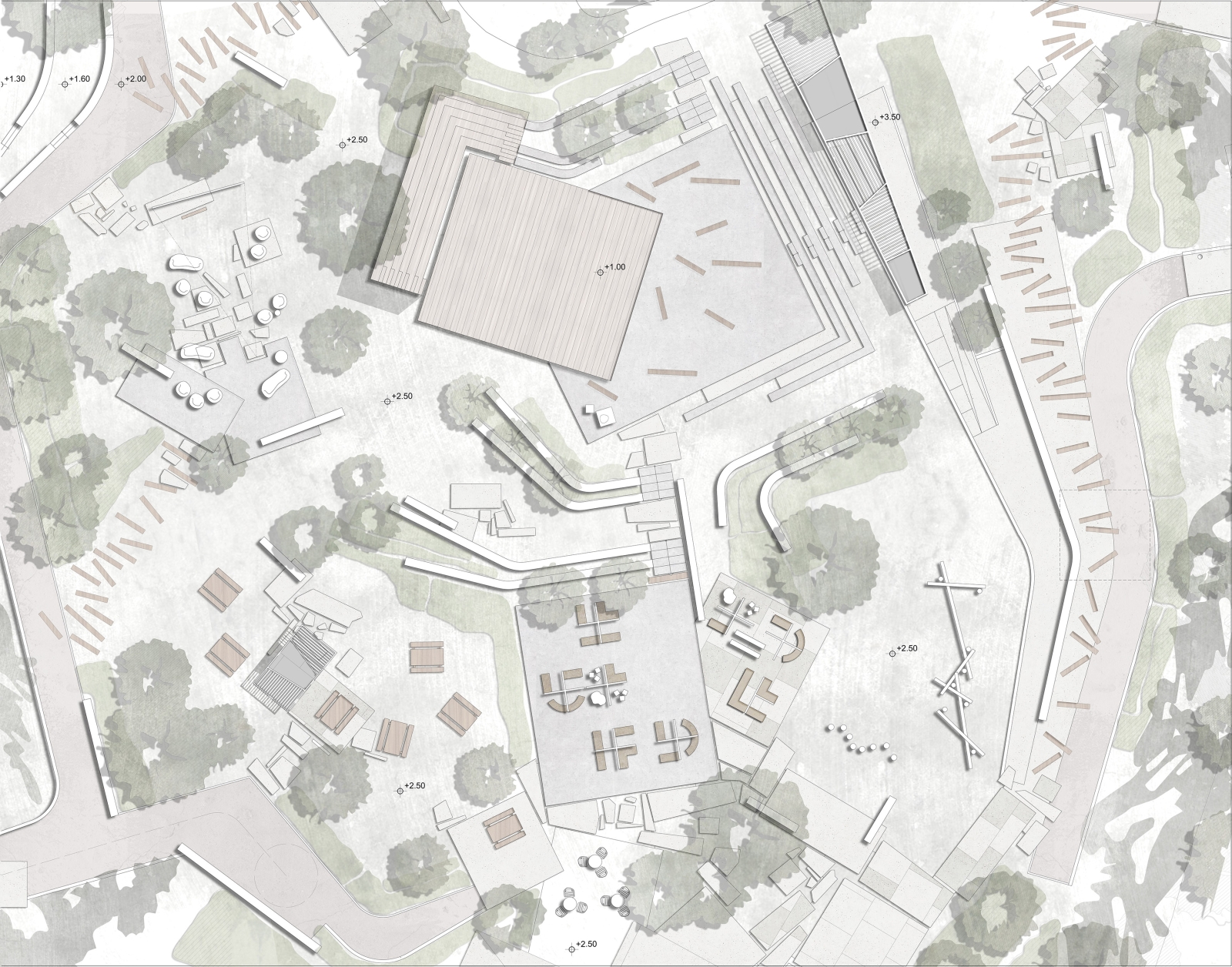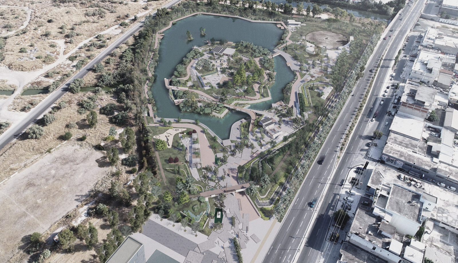 The re-design of the park introduces to the metropolitan area of Volos a new point of reference, a new meeting point both for the citizens and for the visitors of the city. A multifunctional space where many things can take place, where new functions and uses such as sports activities, open-air amphitheater, open-air cinema, public flea market, coffee zone, lake canoe and workshops are combined with rest areas and interesting vegetated zones. The park is being designed and organized in thematic zones, which host different uses characterized by different vegetation. On that way, the park introduces many different zones of use to the visitors while attracting more people on it, unifying the area of the park with the new Museum of Argo, the University Campus nearby and the city center of Volos.