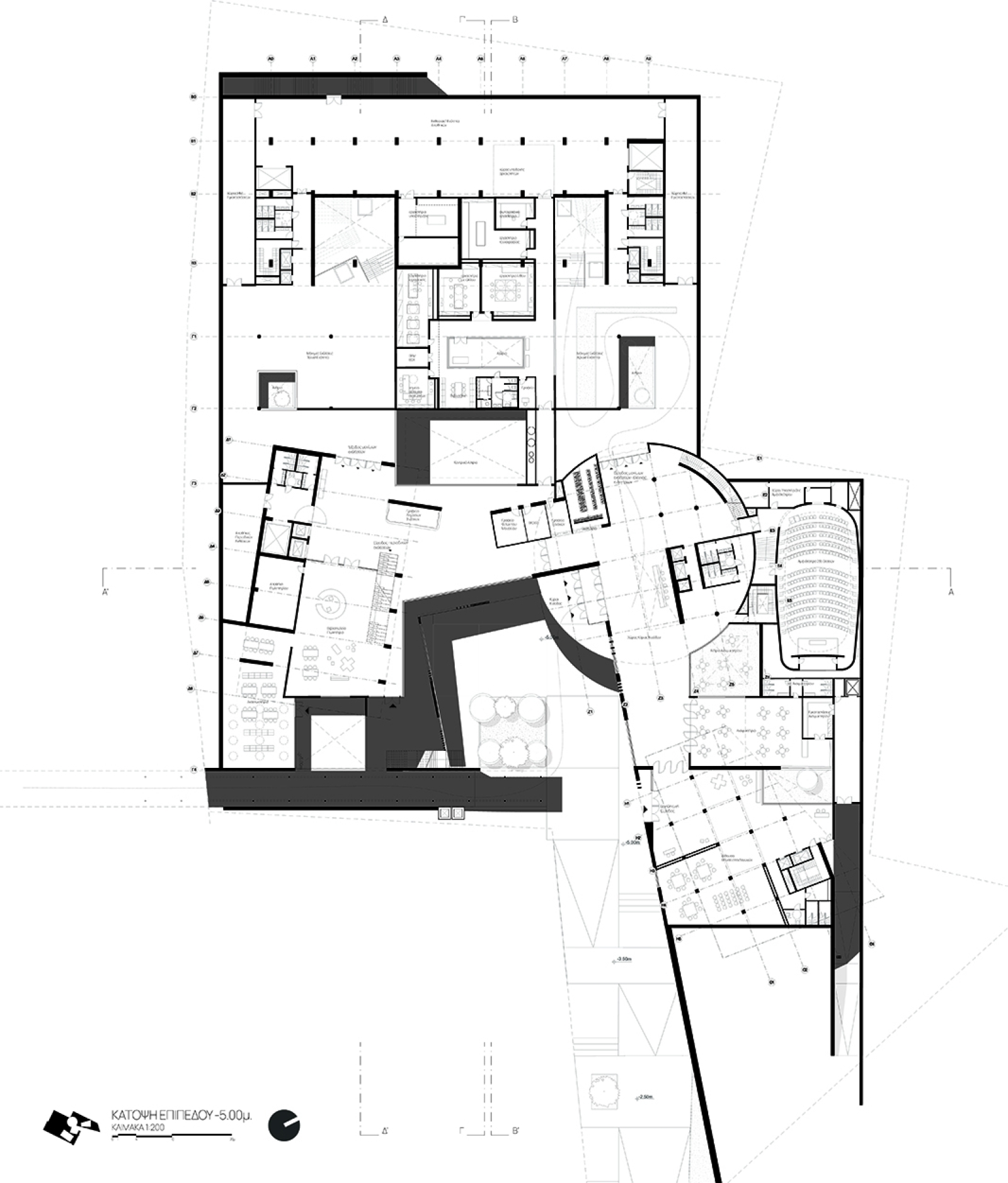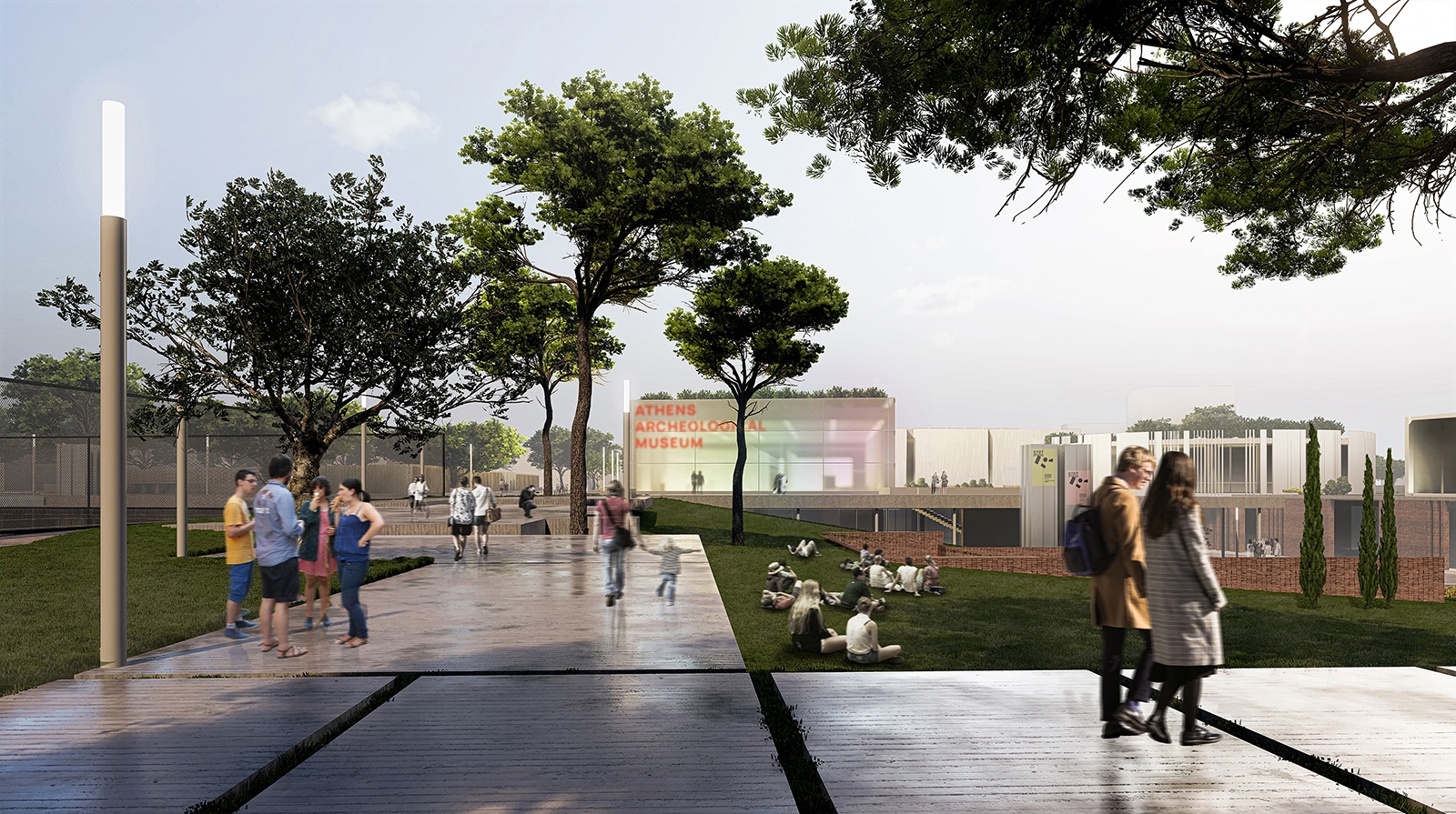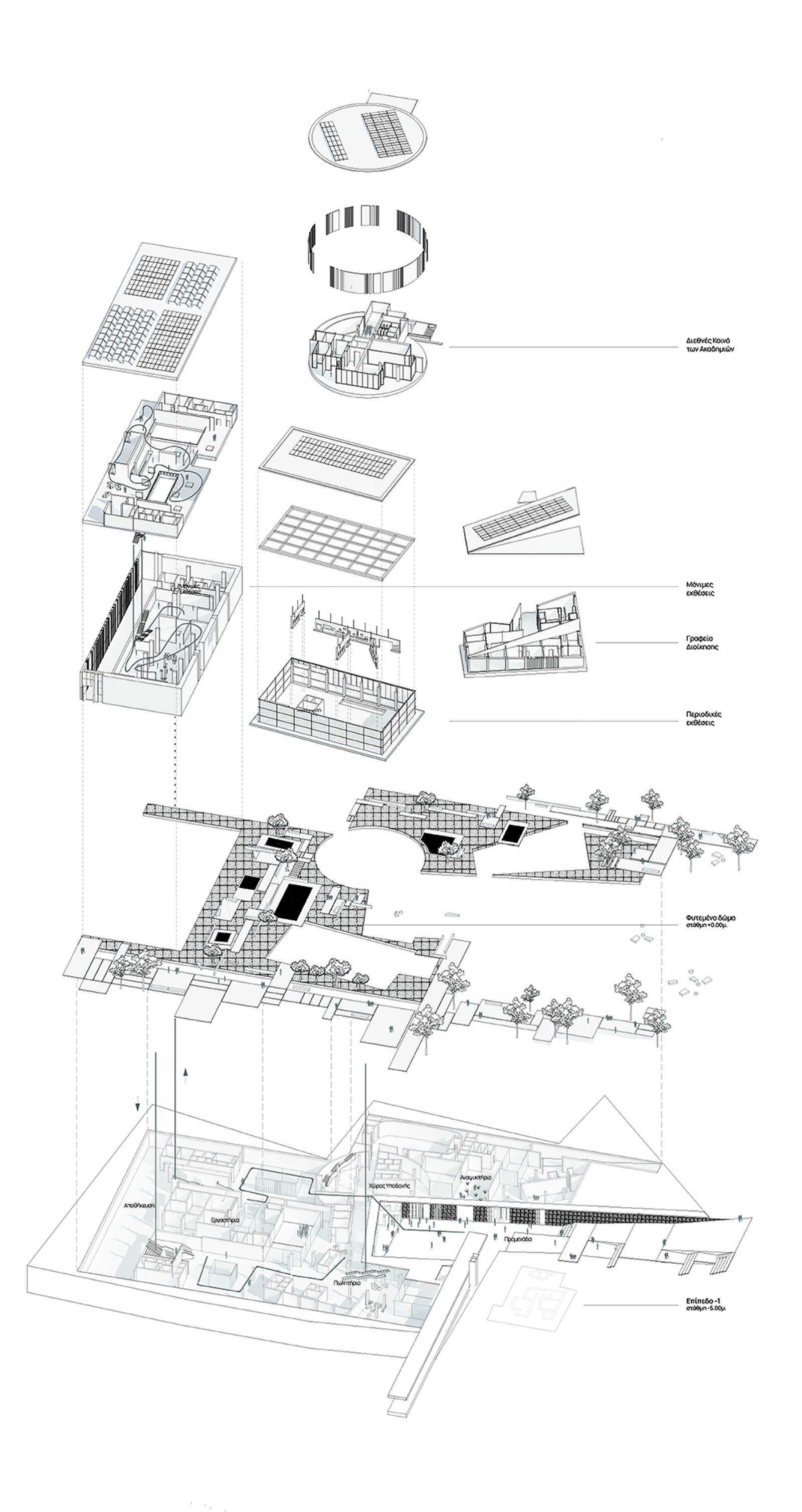 The Museum is placed largely underground in order not to interrupt the urban continuity and the landscape coherence of the existing park. A promenade leads the visitors from the ancient ruins of the Gimnasium to the main entrance of the museum, placed on a cantral patio under the ground level. The building is perceived as an excavation element, while the majority of the public uses and storage areas are covered with extensive greenery forming a new park on the terraces, the basic exhibitory spaces of the permanent and temporary exhibitions are placed in the level 0 in volumes of different shapes. The four "volumes" look like submerging from the excavation area, as modern ruins. Its element has a unique geometry representing the values of the basic geometrical shapes, circle, rectangle and square. The volumes and covered with tempered glass so that they glaze during the night, being transformed in modern "pharos" of culture for the entire metropolitan area of Attica.