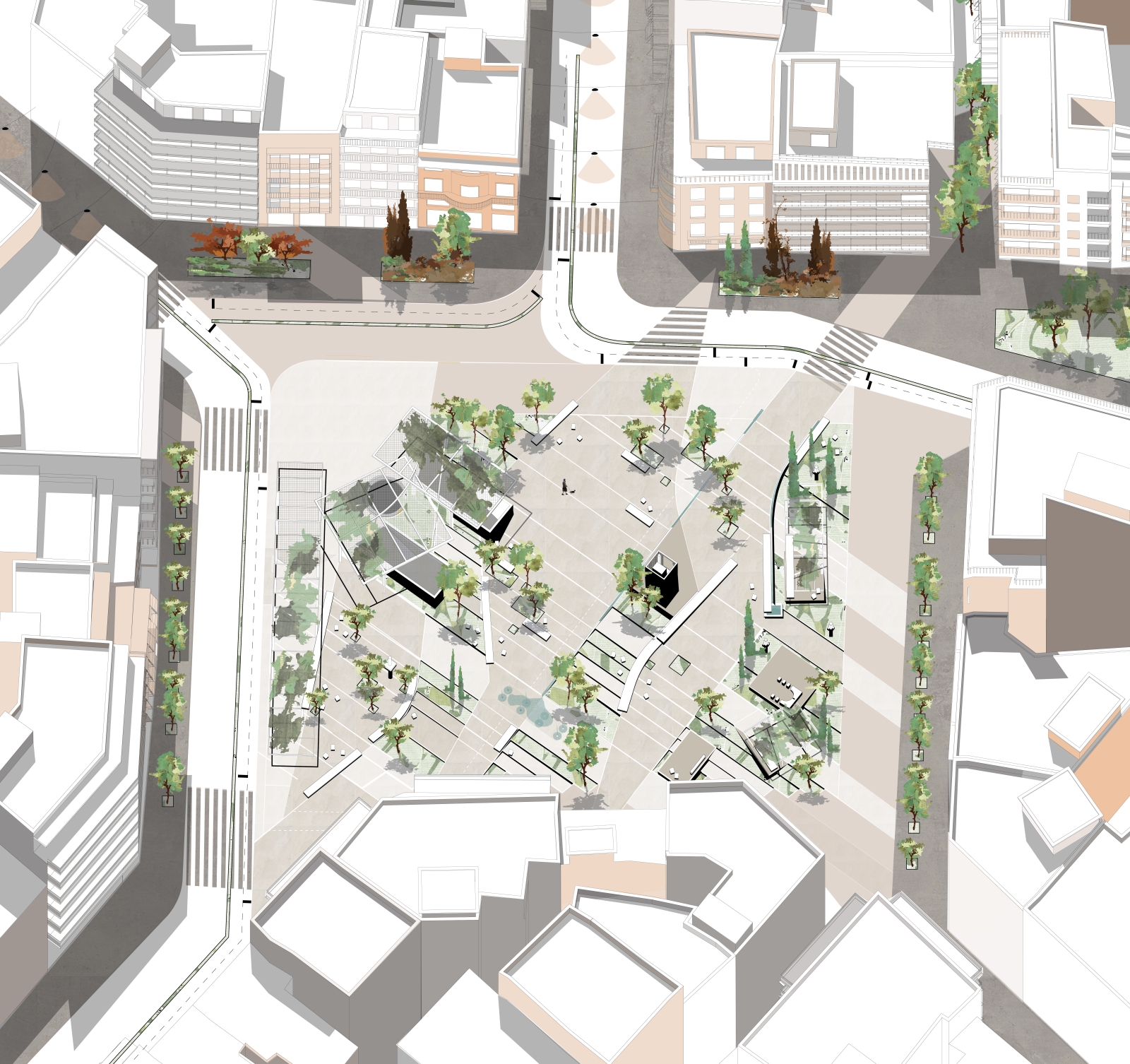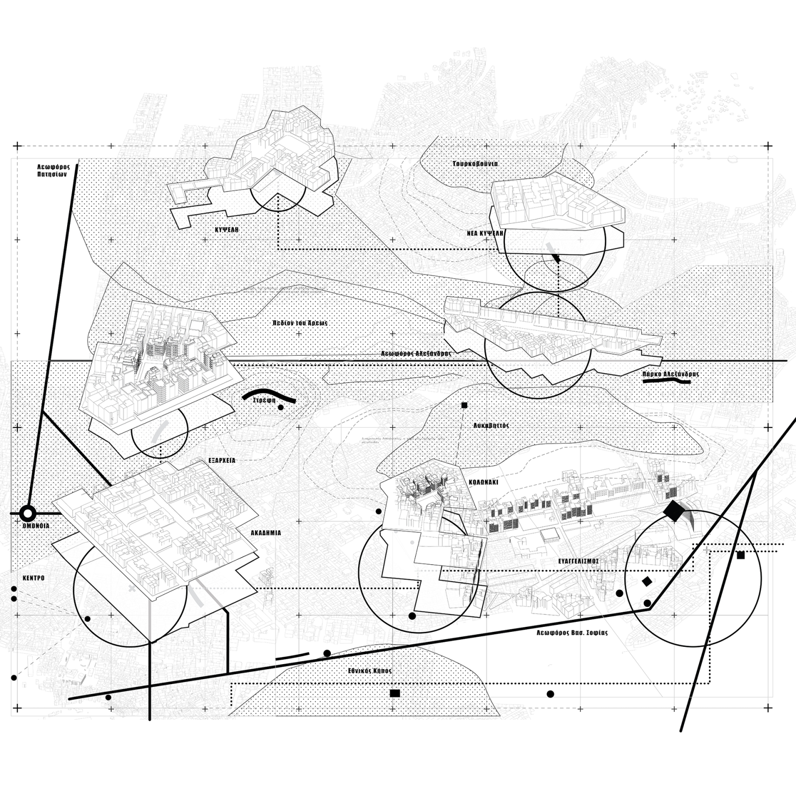 This project proposes a new approach by considering pockets of public space in downtown Athens as independent but interwoven elements of a broader urban fabric. The concept aims to develop a narrative regarding the individual public spaces while retaining the unique qualities of each one.