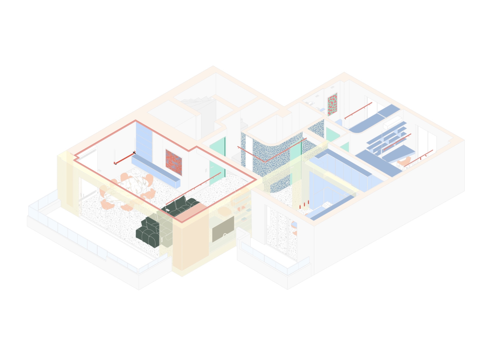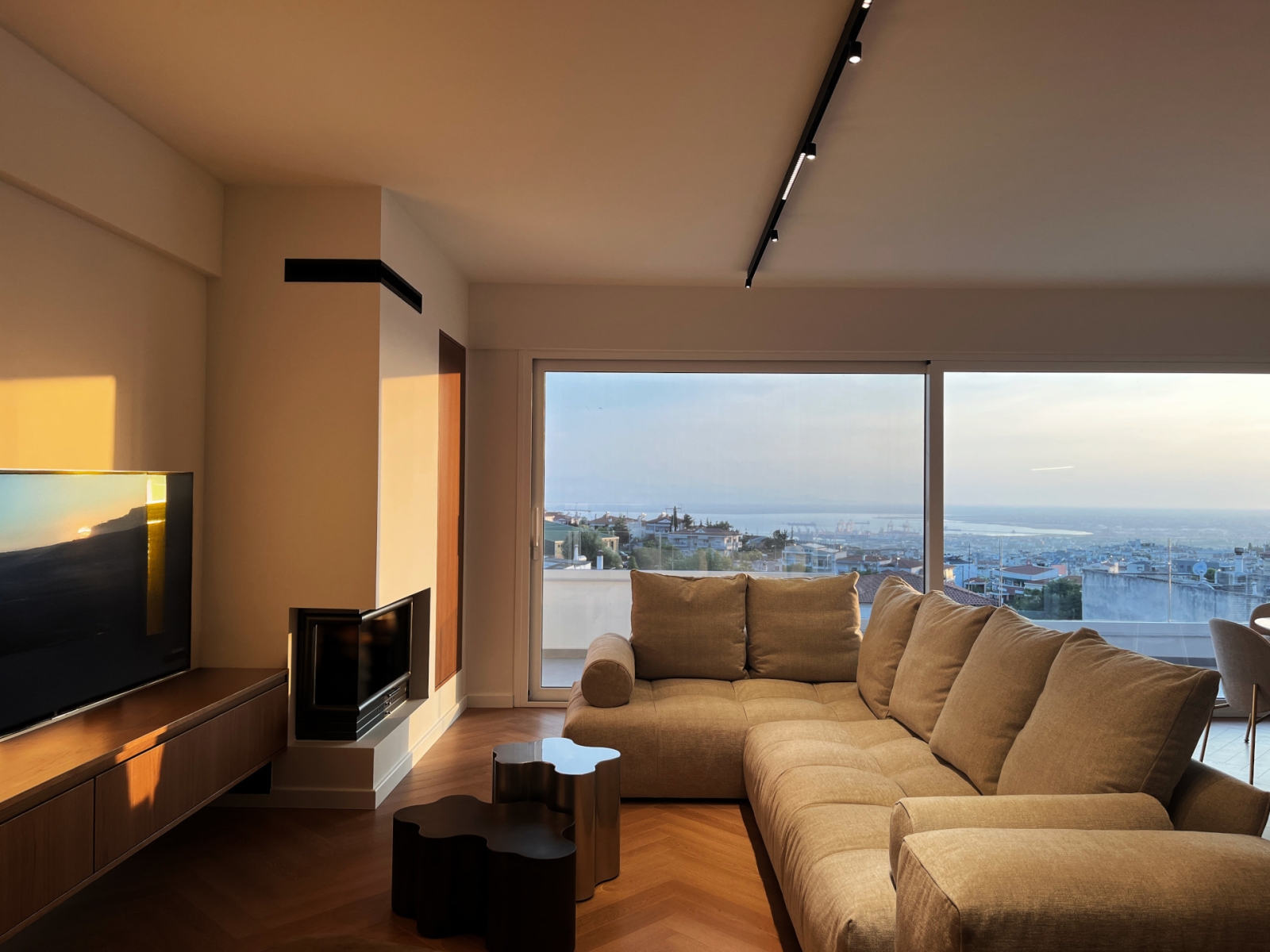 The 200 sqm loft was designed for a family of four in a privileged area of Thessaloniki, offering 360-degree views of the sea and the surrounding landscape. The apartment is organized across two levels: the first floor hosts all communal areas, including the living and dining spaces, an open kitchen, a guest WC, and two children’s bedrooms. The upper floor accommodates the master suite, consisting of a bedroom, a vestibule, and an en-suite bathroom.