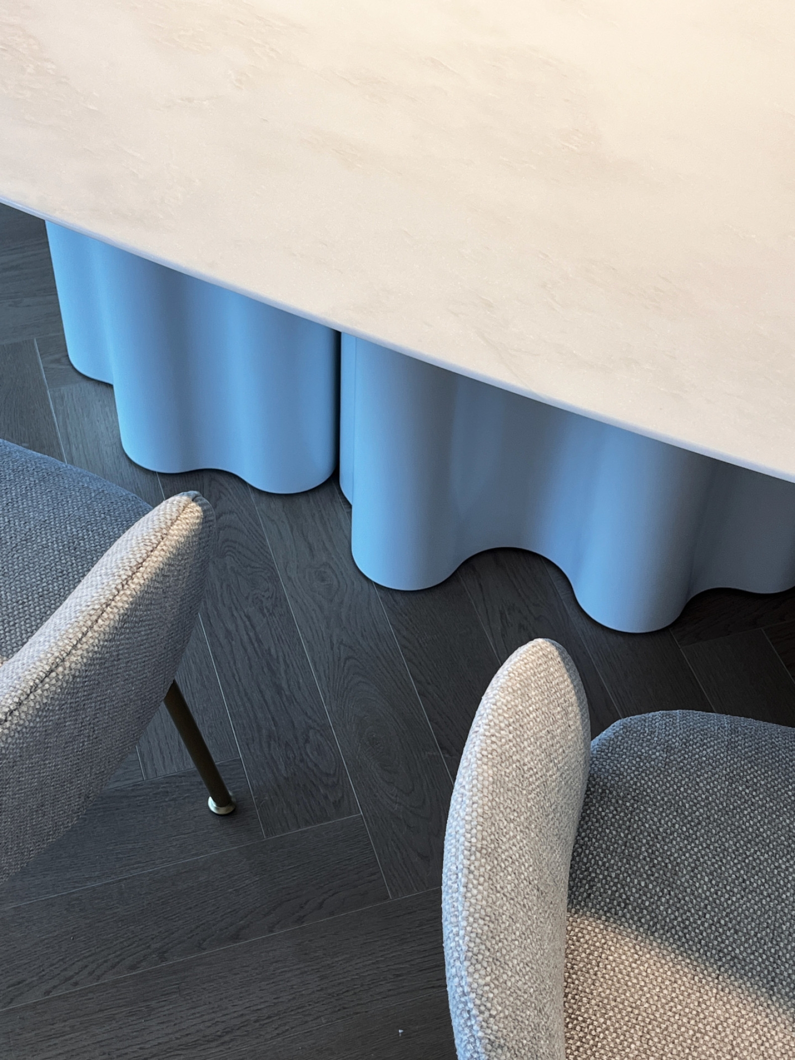 The design concept centers on the use of natural materials and refined contrasts — a continuous wooden floor throughout all areas is paired with stainless-steel surfaces, a white marble dining table for eight, and carefully selected furniture and lighting pieces from renowned brands such as Saba Italia, Kristalia, Ditre Italia, and Stosa Cucine.